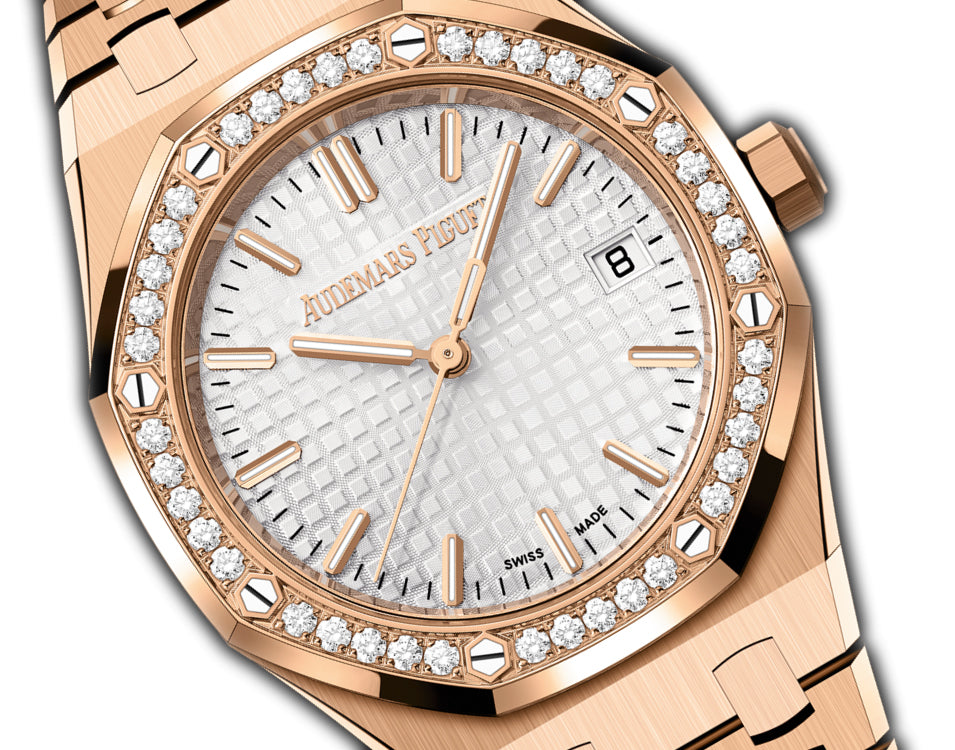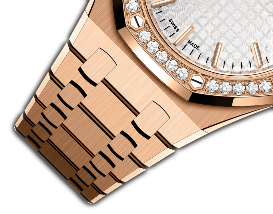 The case is made of 18k rose gold, most of which displays a satin finish with the exception of the beveled edges which are of a mirror-finish. Following the same configuration is an 18k rose gold bracelet. AP designed this bezel with 40 brilliant-cut diamonds weighing approximately 0.71 carats in total.
