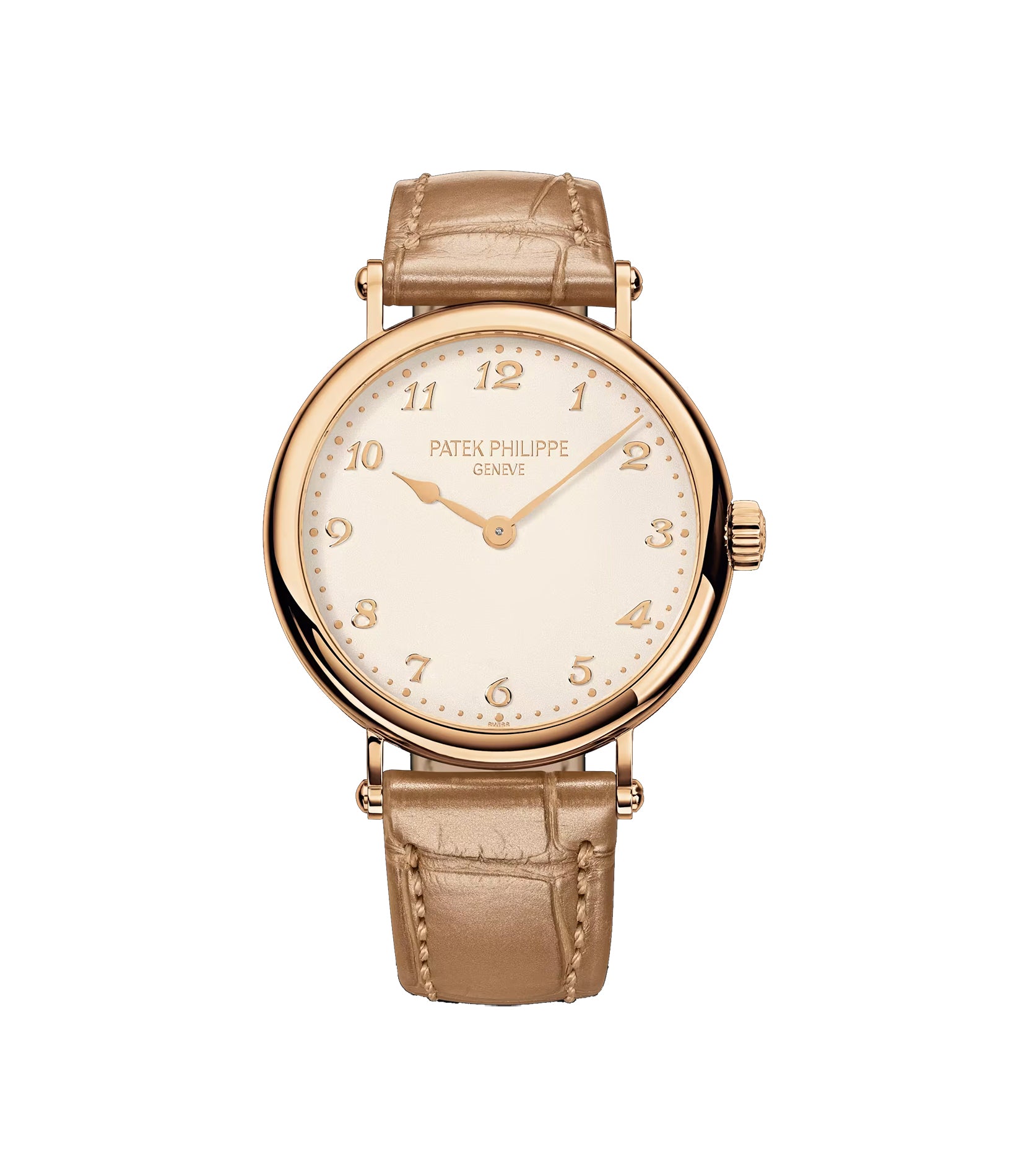 Case is made of mirror finished 18k rose gold as is the bezel mounted atop. The watch is paired with a beige leather strap that is accompanied by an 18k rose gold tang buckle.