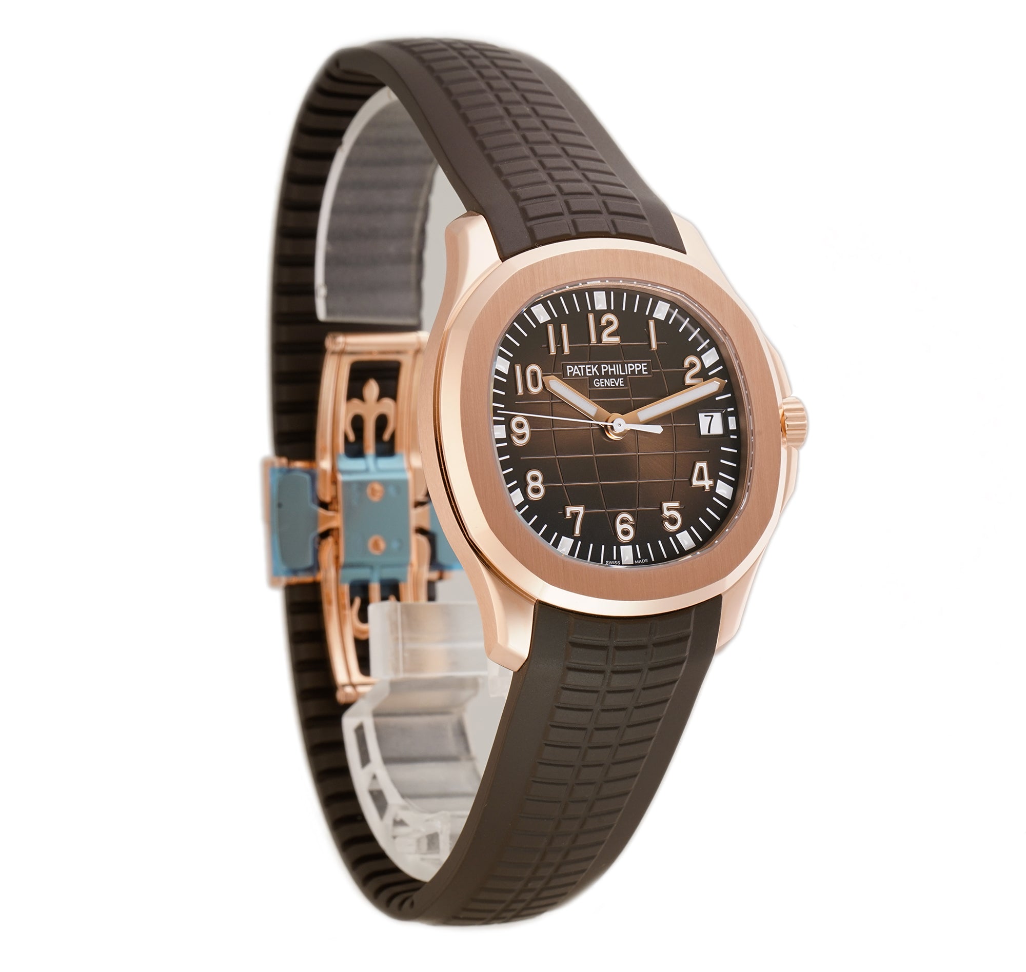 Time and date are displayed on a sunburst brown with black-gradient rim, embossed aquanaut patter dial that is accompanied by luminescent filled gold hands as well as luminescent filled gold applied Arabic numerals and luminescent applied markers on the outskirts.