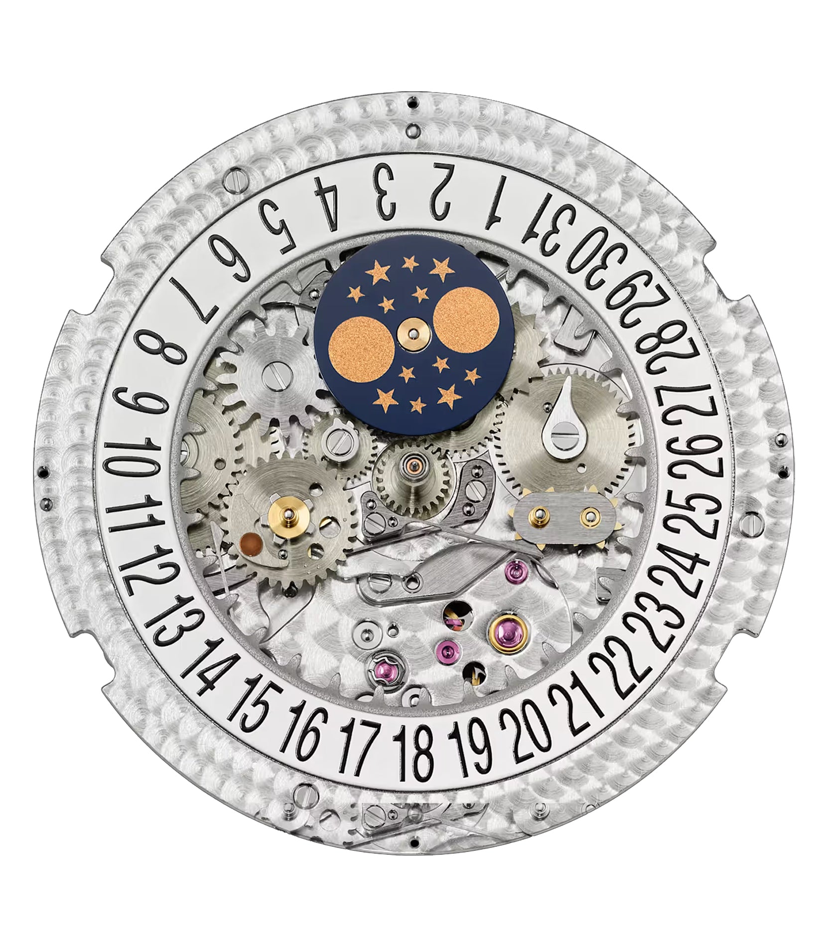 Functions are displayed on a blue-grey dial that is accompanied by luminous hands and hour markers. Those functions include hours, minutes, seconds, date, day, month as well as a moon phase display.