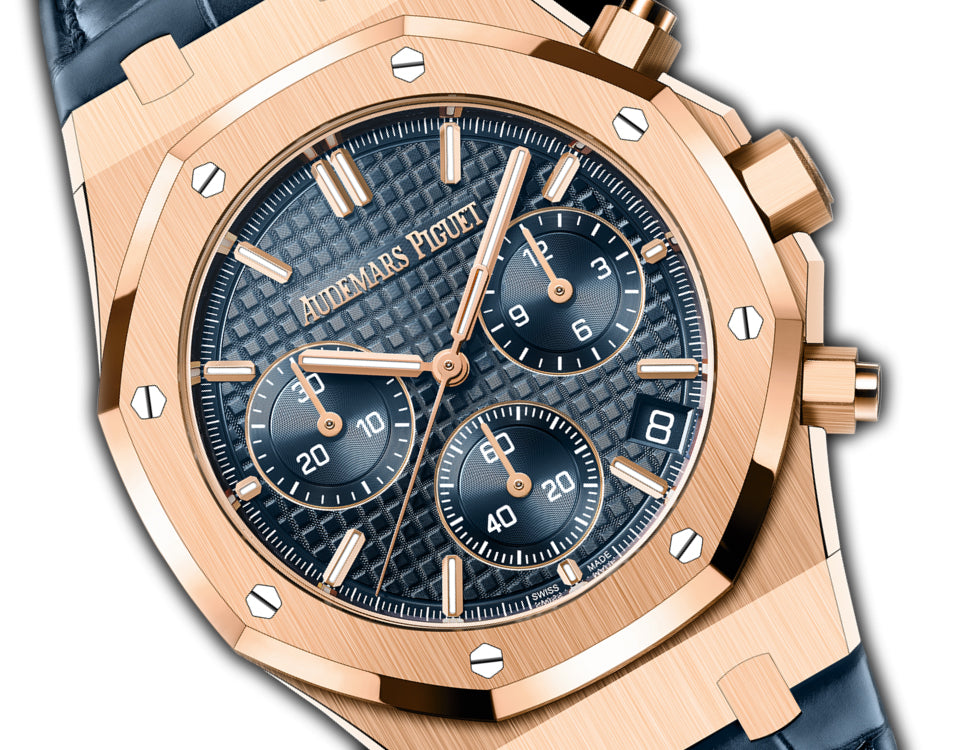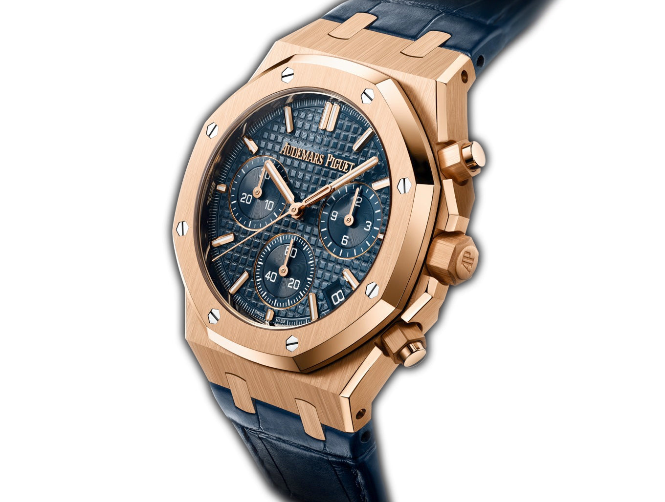 The case is made of 18k rose gold, mostly satin finished with the exception of the beveled edges which are of high-polished finish. Mounted atop the case is a brush-finished 18k rose gold with high-polish finished beveled edges as well. It is presented on a blue leather strap with matching stitching and that is paired with an 18k rose gold deployment buckle.