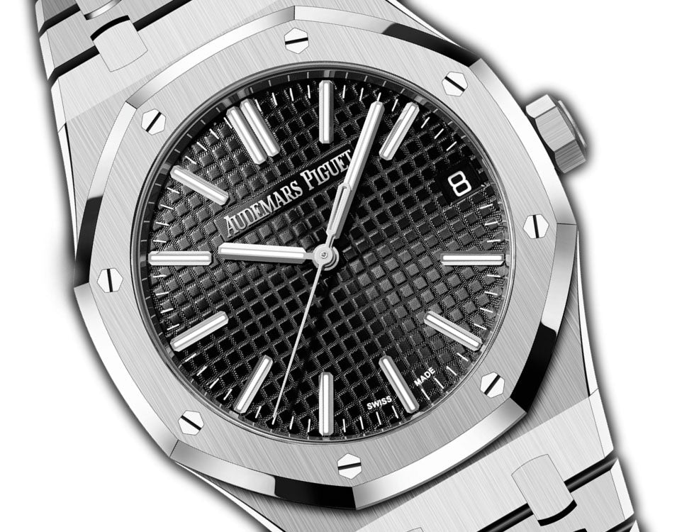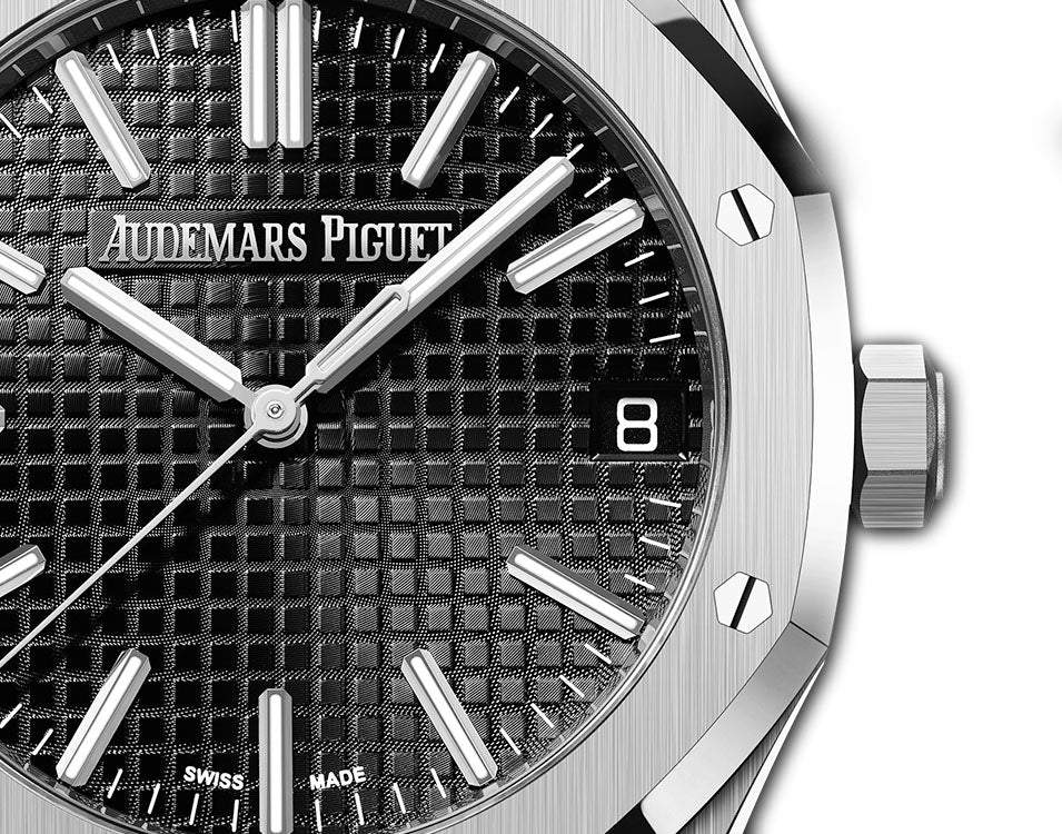 Time and date are displayed on a black waffle-design dial which is accompanied by luminescent filled hands and index hour markers. A date aperture is located at the 3 o’clock position.