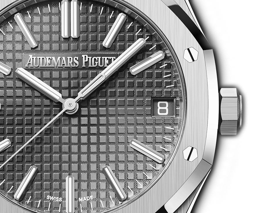 Time and date are displayed on a grey waffle-design dial which is accompanied by luminescent filled hands and index hour markers. A date aperture is located at the 3 o’clock position.