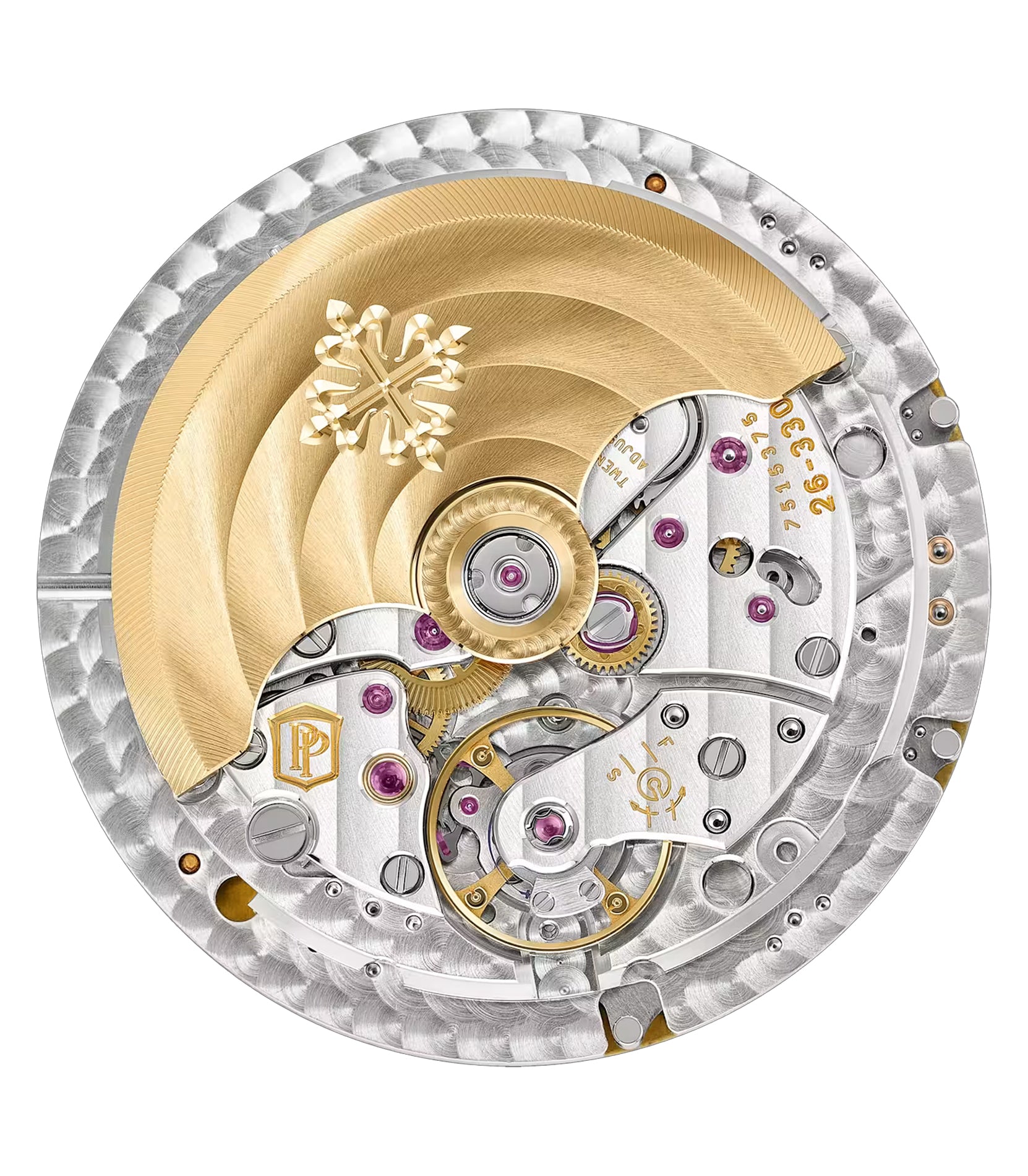 Functions are displayed on a sunburst brown embossed dial that is accompanied by luminescent filled gold hands as well as luminescent filled gold applied Arabic numerals and luminescent applied markers on the outskirts.