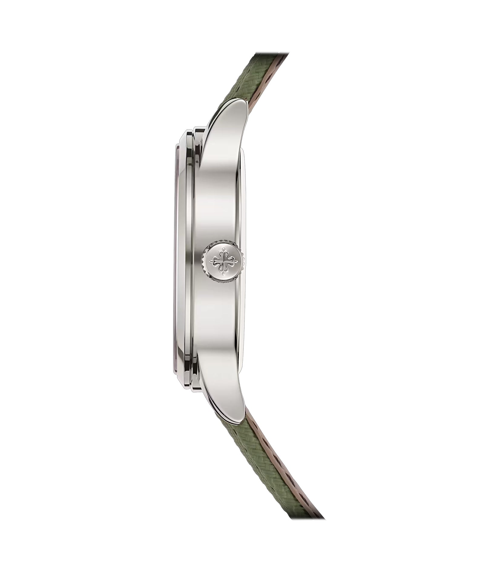 Case is made of a mirror finish 18k white gold including the fluted crown. Mounted atop the case is a smooth 18k white gold bezel in mirror finish. The watch is paired with a khaki green color strap composite material, fabric pattern with a white gold clevis prong buckle.