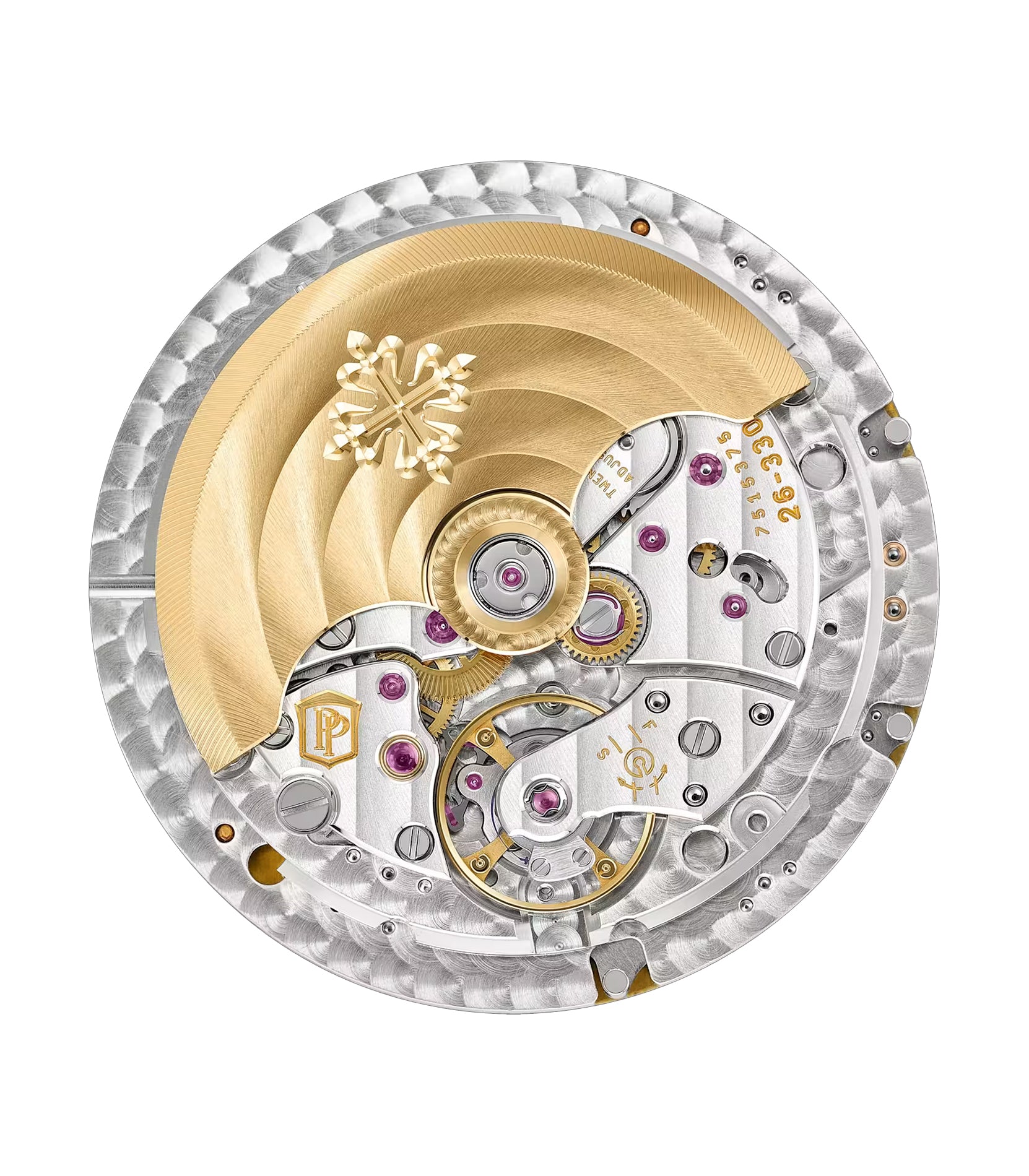 Functions are shown on a ivory lacquered dial and blackened white gold applied numerals with luminescent coating.