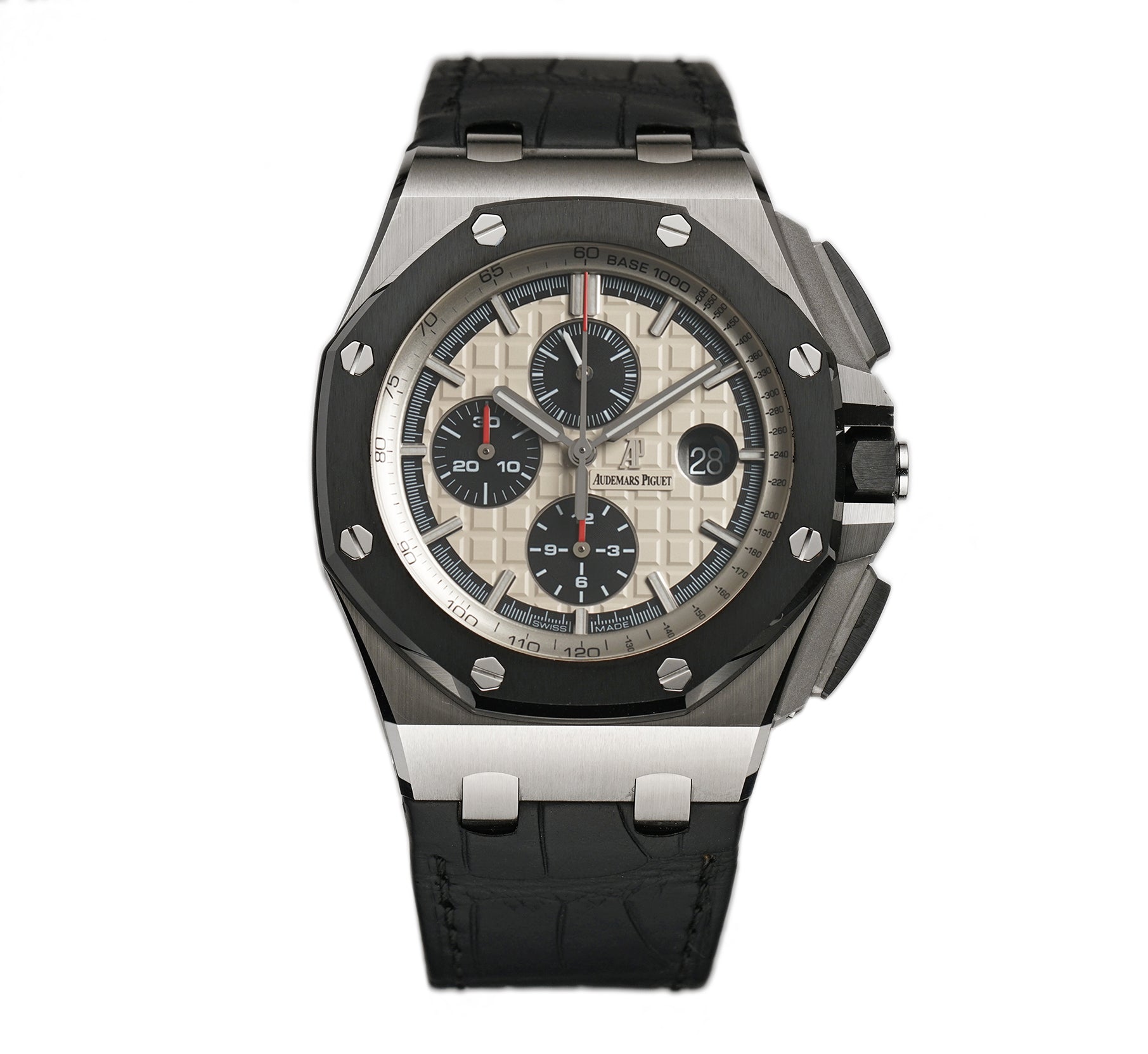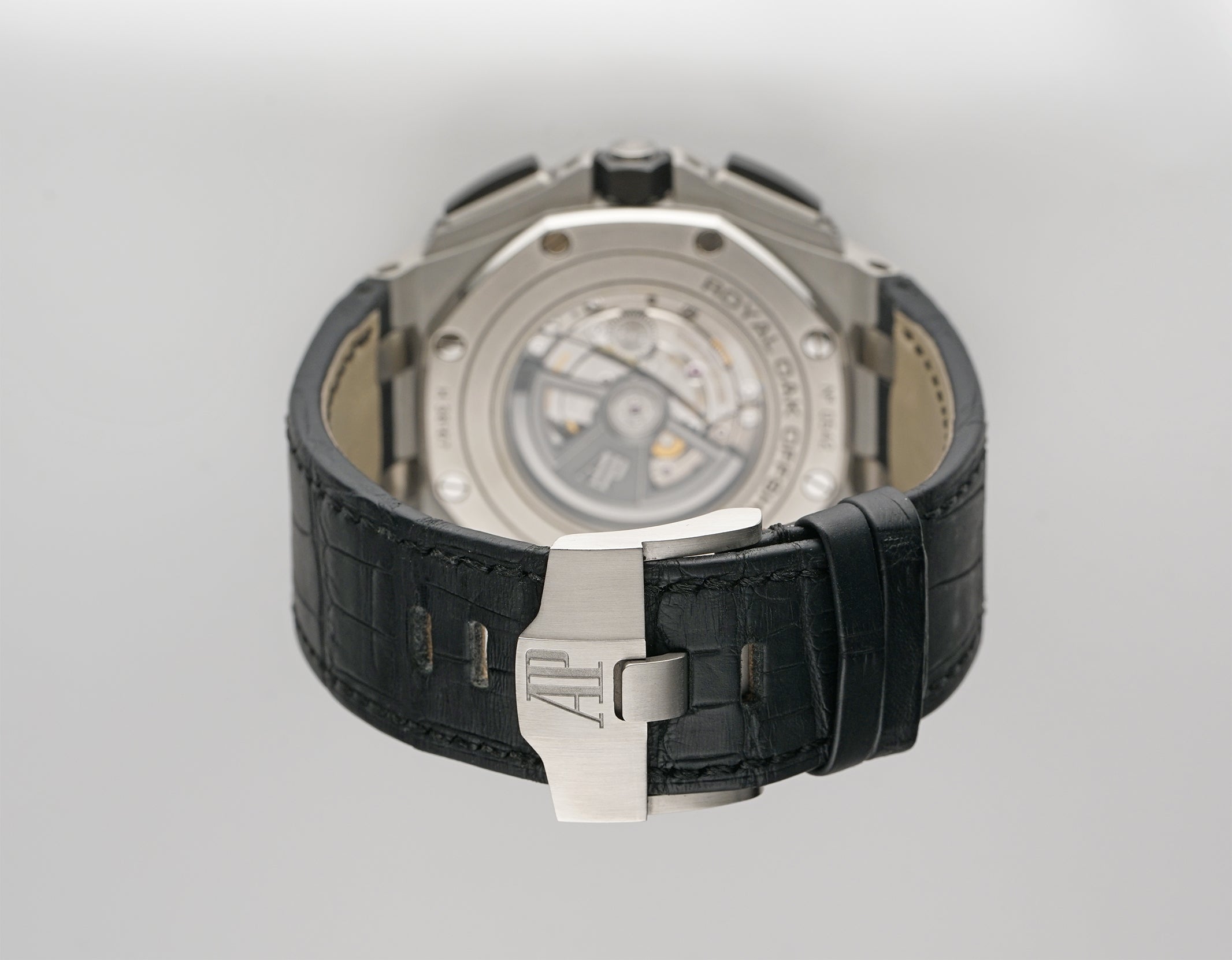 The case is made of stainless steel, most of which is satin-finished with the exception of the beveled edges which have that mirror finish. Mounted atop the case is a black ceramic bezel that displays the same contrast of satin and mirror finishes. The crown and push-buttons are black ceramic as well. The watch is paired with an original black leather AP strap (95% condition) that is accompanied by a stainless steel AP tang buckle.