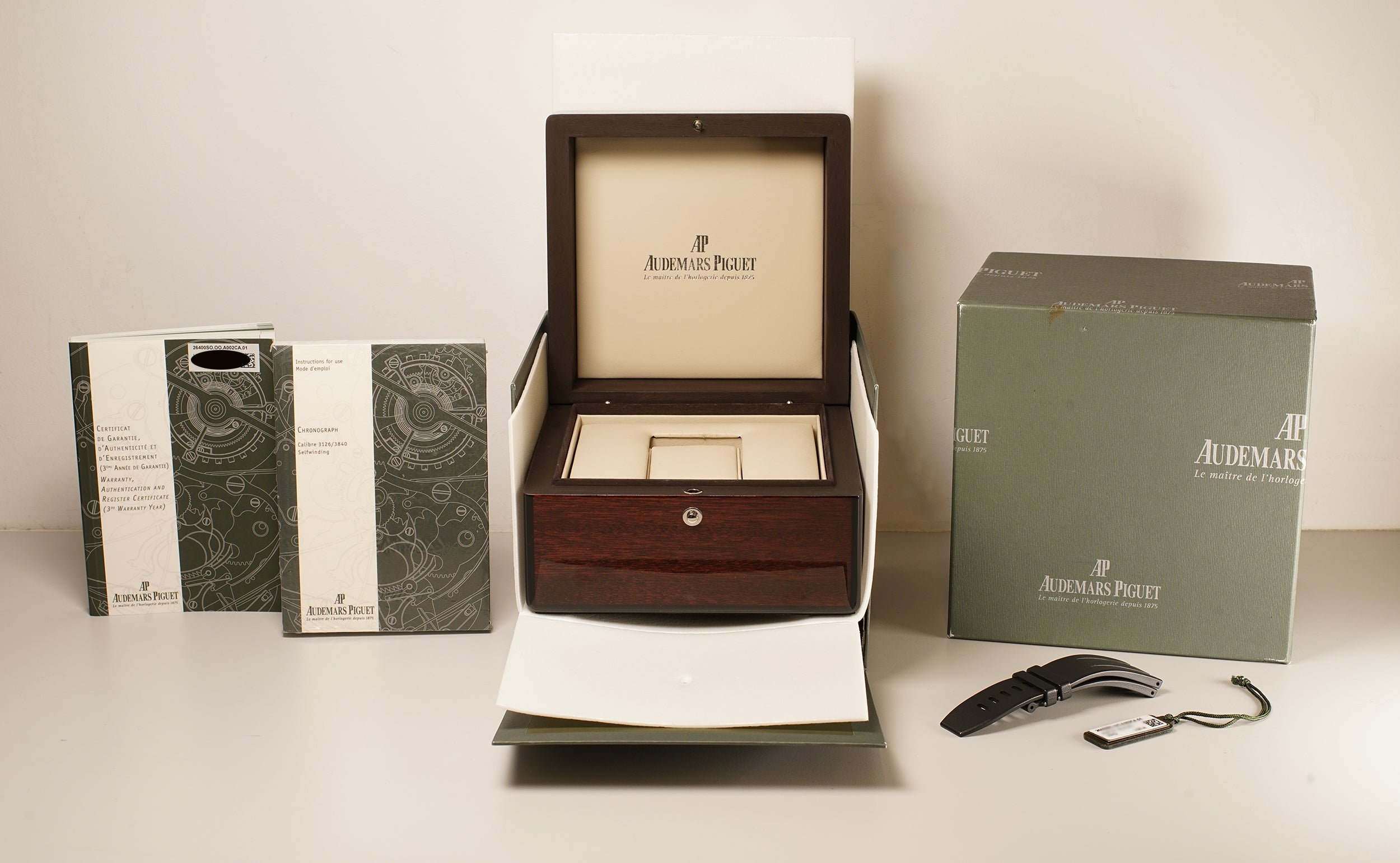 The watch comes with the original full set of box and papers as well as an additional black rubber AP strap (85% condition).