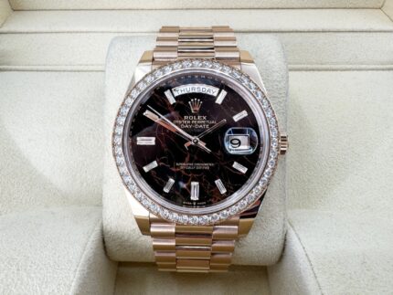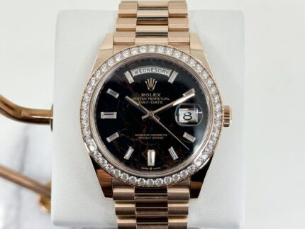 Steel case, fluted crown set with a synthetic spinel cabochon, sapphire crystal, 18 carats rose gold 12 zones flinqué dial, with sun-like finish and lacquer, set with 11 brilliants, blued steel sword-shaped hands. 18k rose gold and steel bracelet. Mechanical movement with automatic winding, water-resistant up to 30 metres/ 100 feet.Case dimensions: 36.6 mm diameter, 12.05 mm thickness.