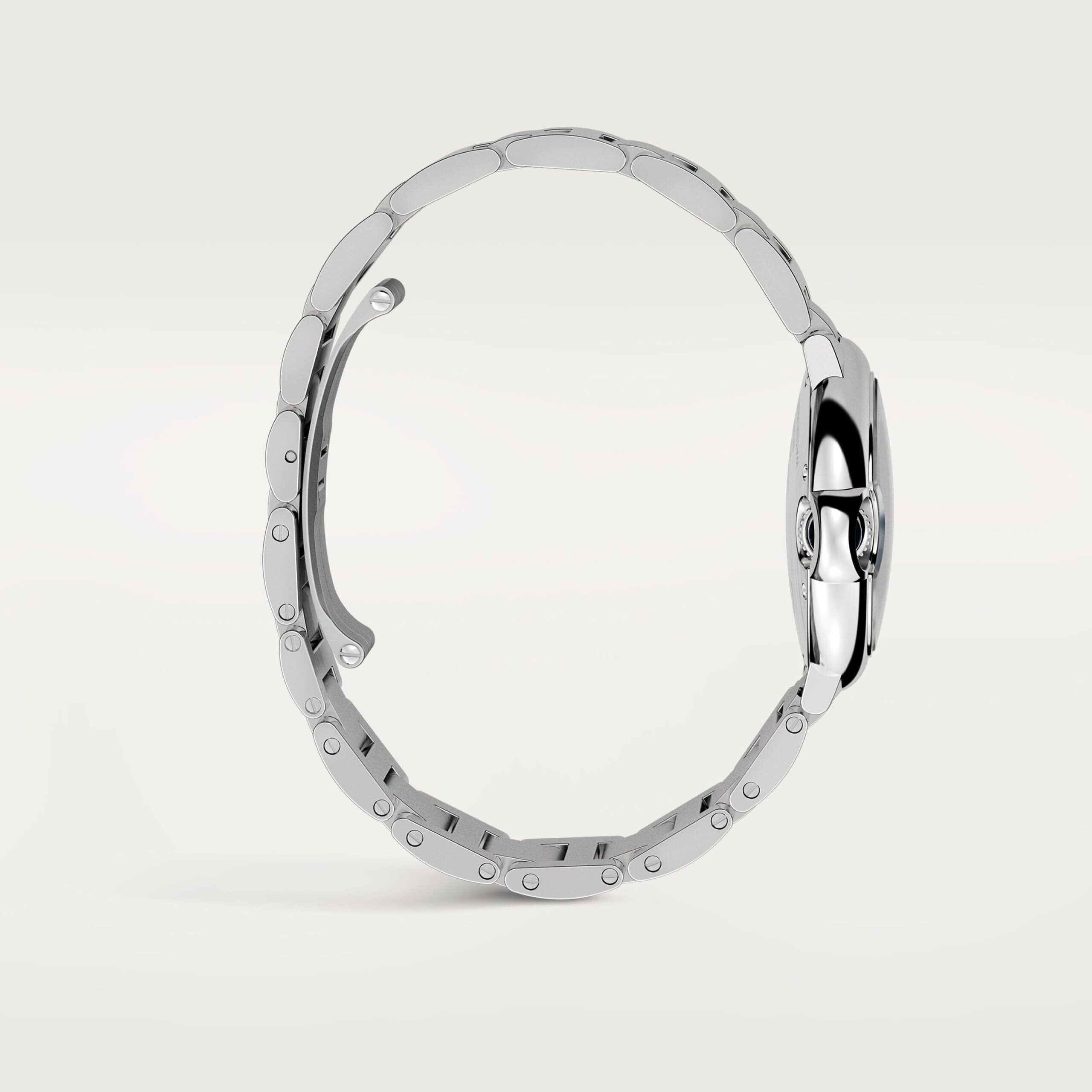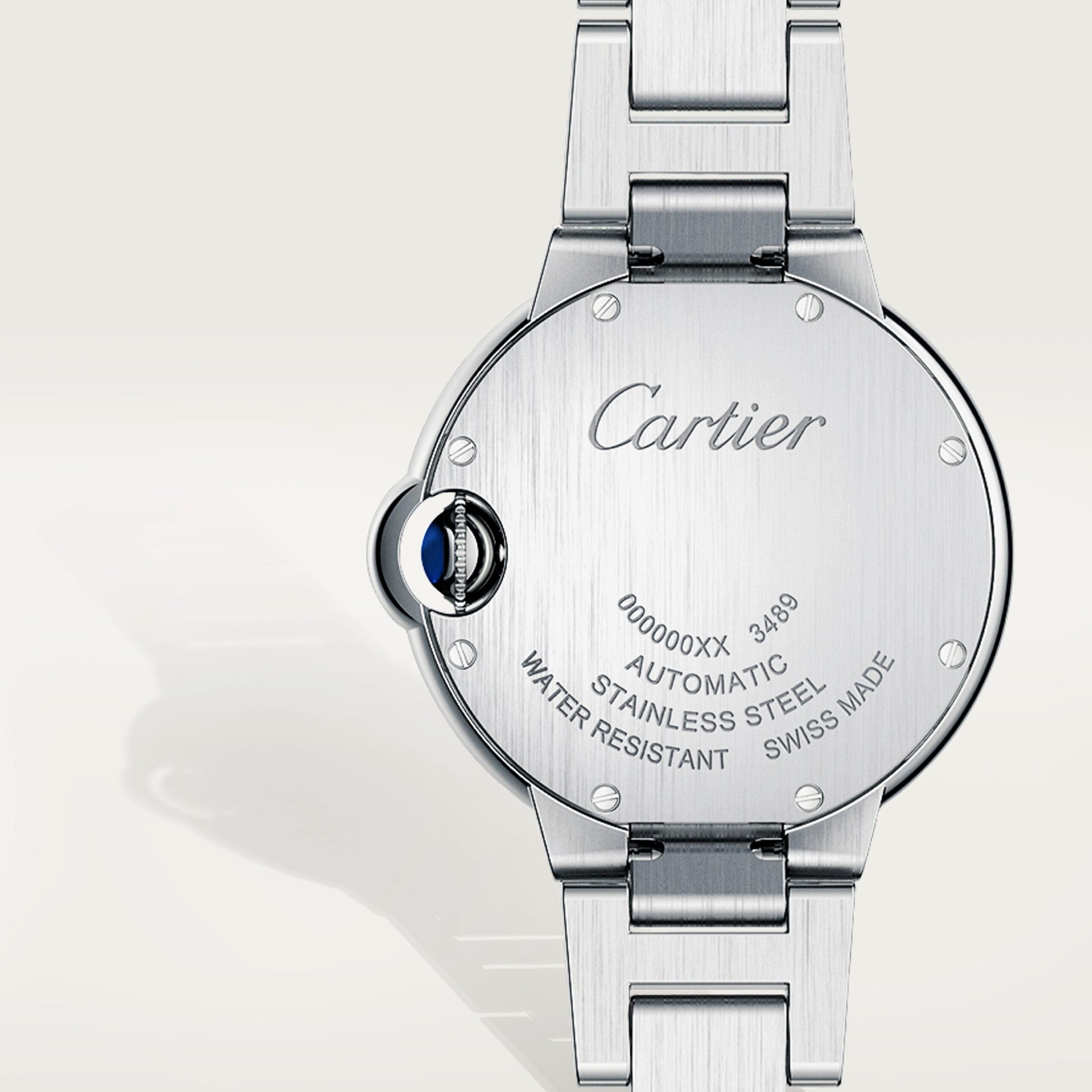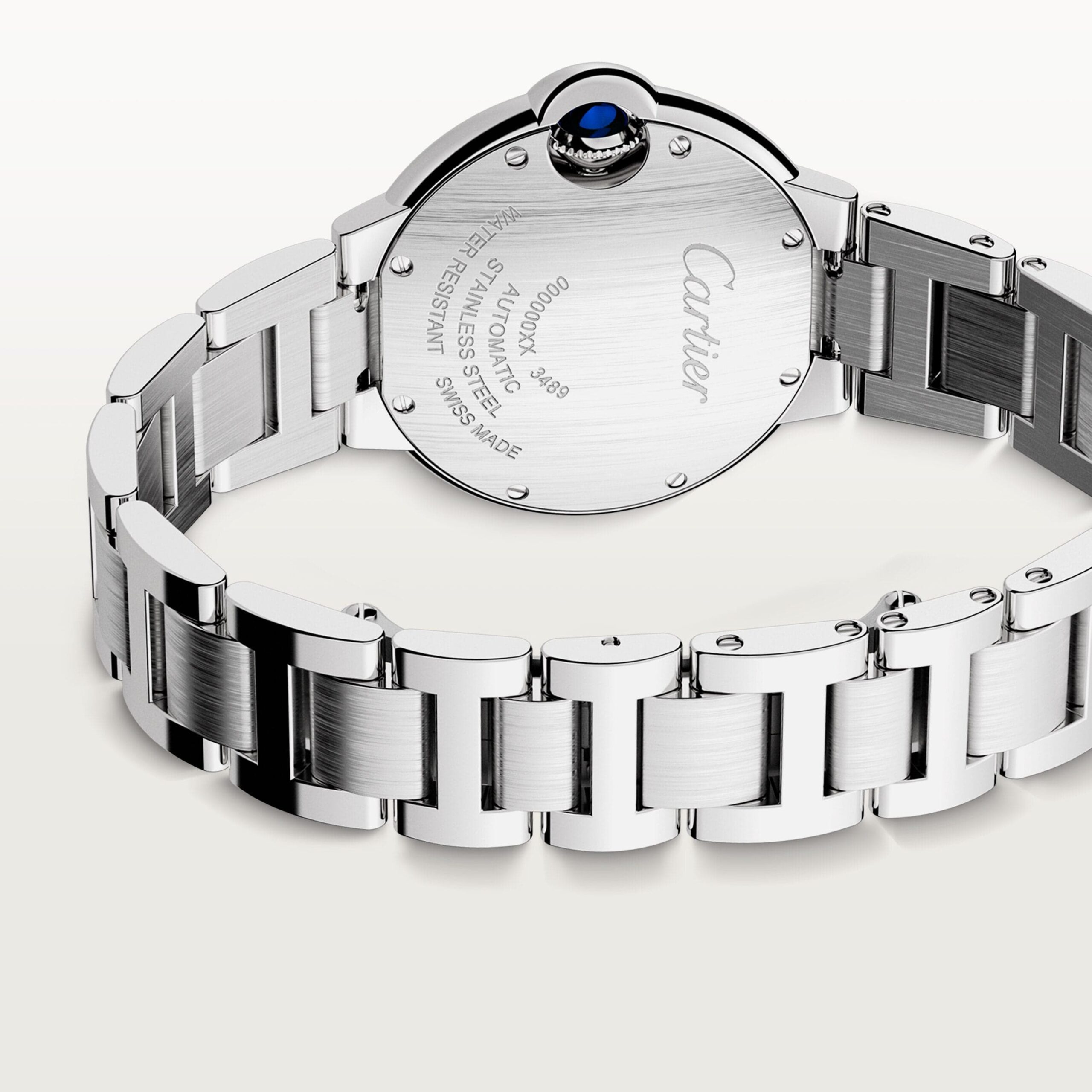 Ballon Bleu de Cartier watch, 33 mm, mechanical movement with automatic winding. Steel case, fluted crown decorated with a synthetic spinel cabochon, silvered guilloché opaline dial, Roman numerals, blued-steel sword-shaped hands, sapphire crystal, steel bracelet. Case dimensions: diameter: 33 mm, thickness: 9.96 mm. Water-resistant to 3 bar (approx. 30 meters/100 feet).
