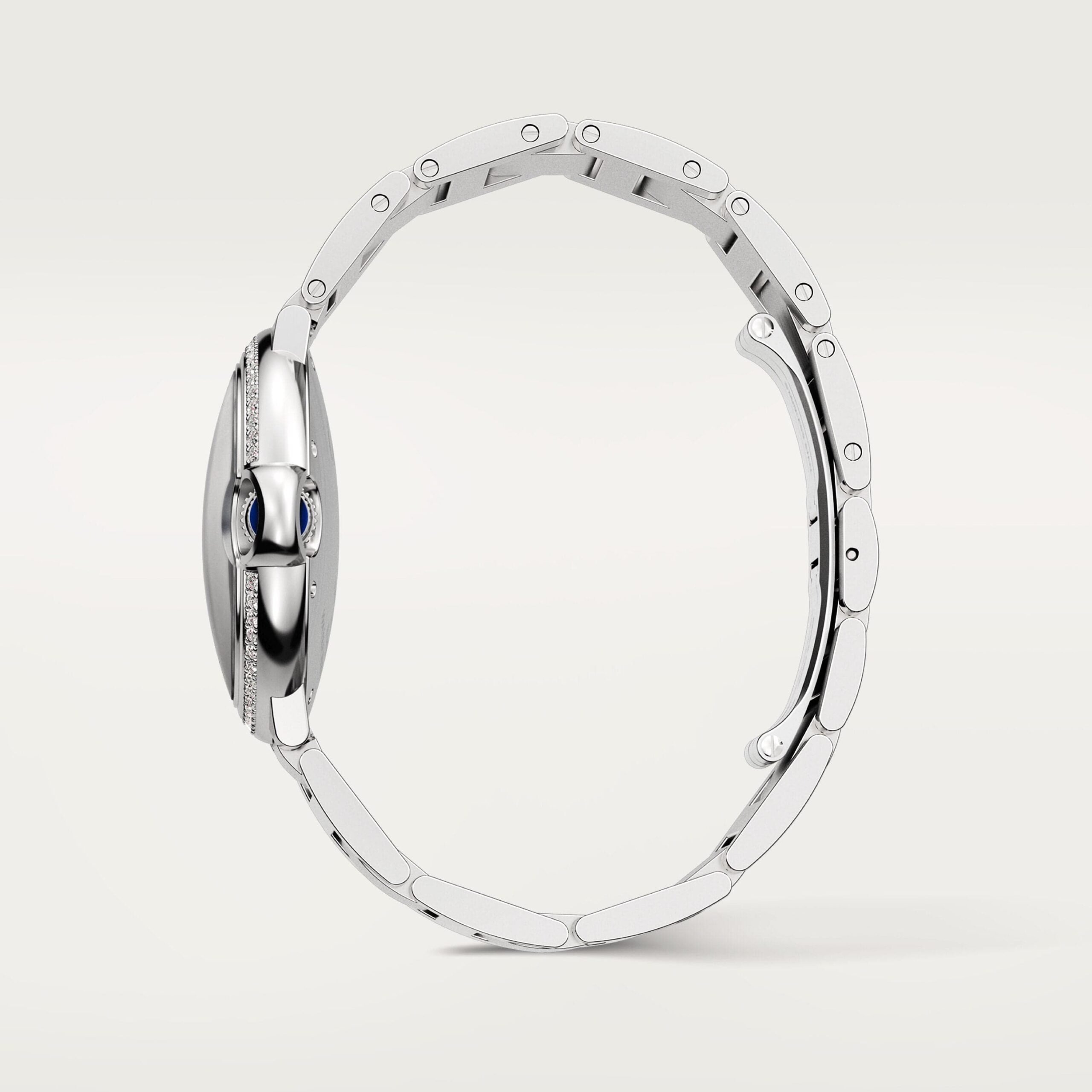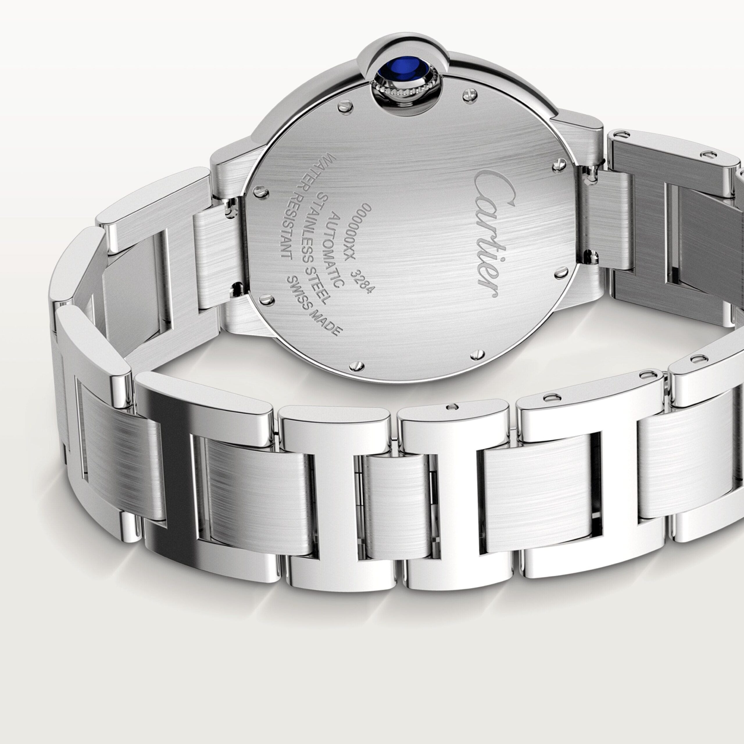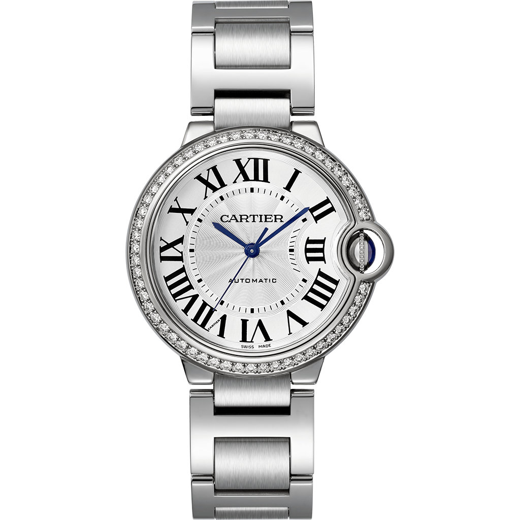 Ballon Bleu de Cartier watch, 36 mm, mechanical movement with automatic winding. Steel case, fluted steel crown set with a cabochon synthetic spinel. Steel bezel set with 54 brilliant-cut diamonds totaling 0.79 carat. Silver guilloché dial. Blued-steel sword-shaped hands. Sapphire crystal. Steel interchangeable bracelet. Case thickness: 12.1 mm. Water-resistant up to 3 bar (approx. 30 meters/100 feet).