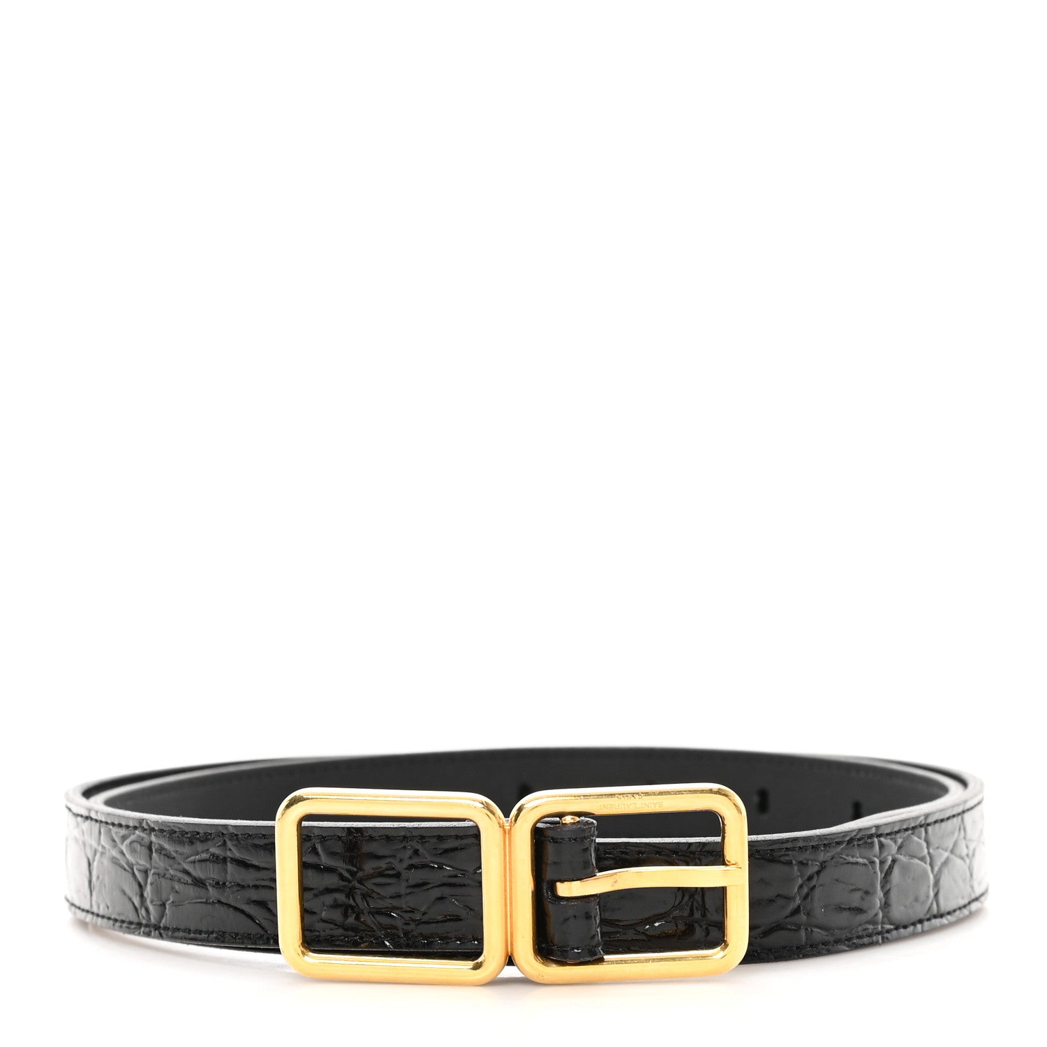 This is an authentic SAINT LAURENT Calfskin Crocodile Embossed Square Buckle Belt size 80 or 32 in Black. This belt is crafted of crocodile embossed calfskin leather in black with a square gold buckle.