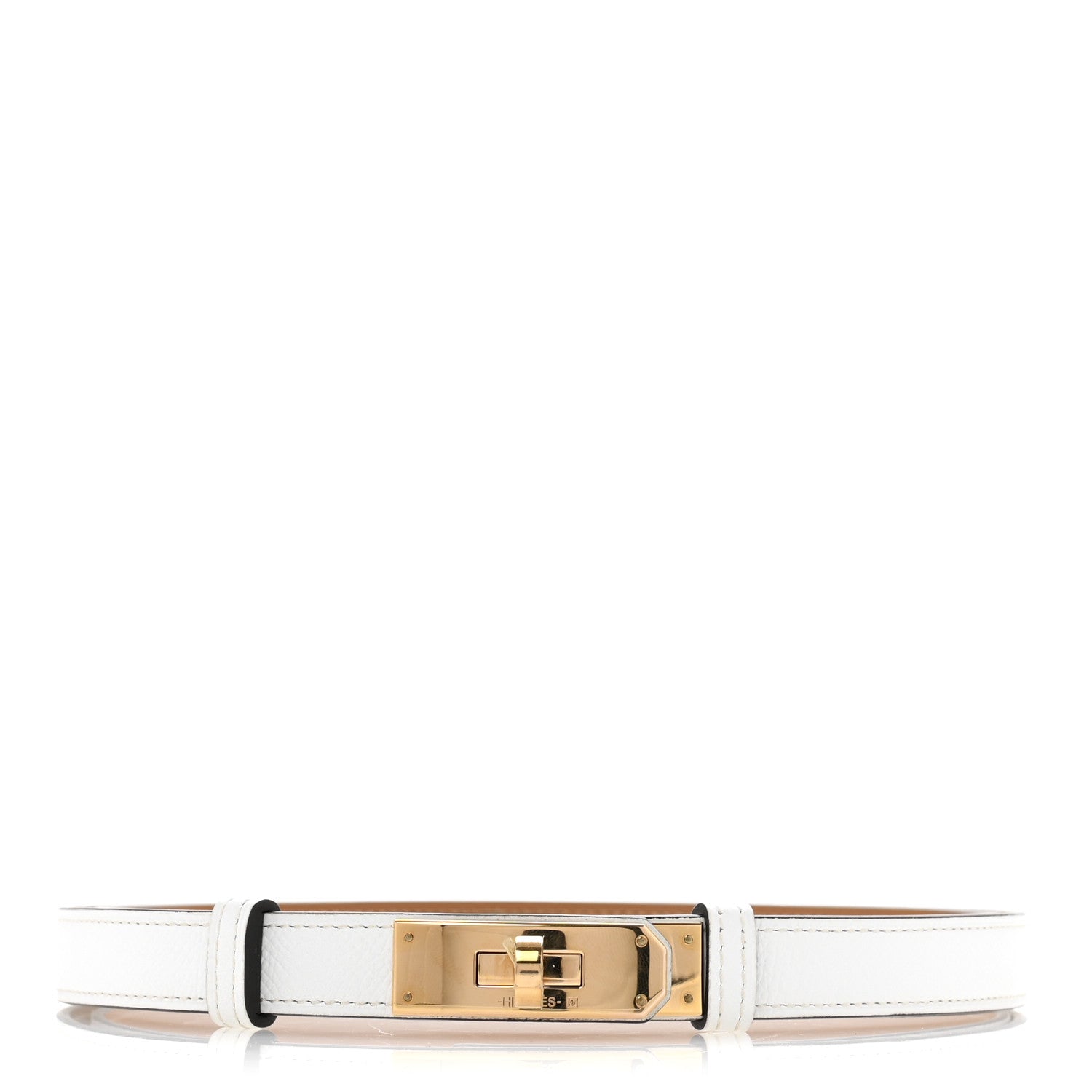 This is an authentic HERMES Epsom Kelly Belt in White. This belt is crafted of Epsom calfskin leather in white. This one-size-fits-most belt features a discreet sliding system and can be worn at the waist or low at the hips, secured with a gold-plated Kelly turn lock on the front.