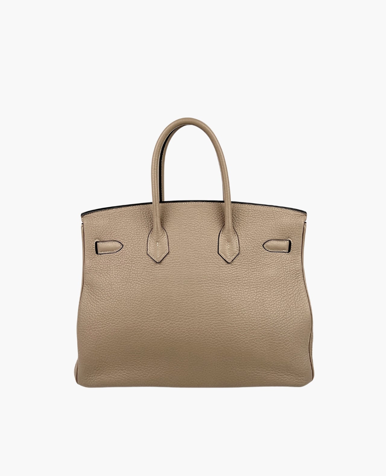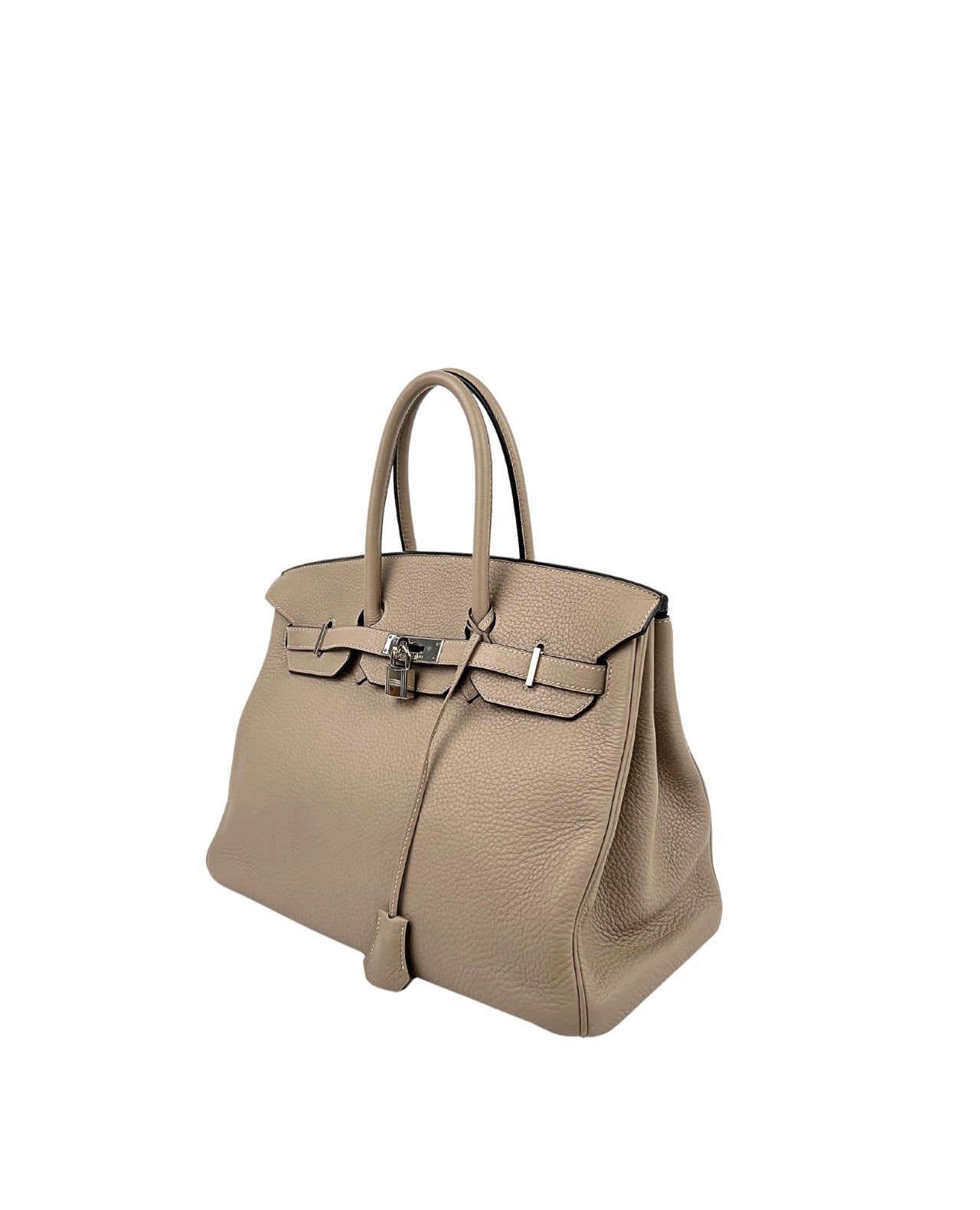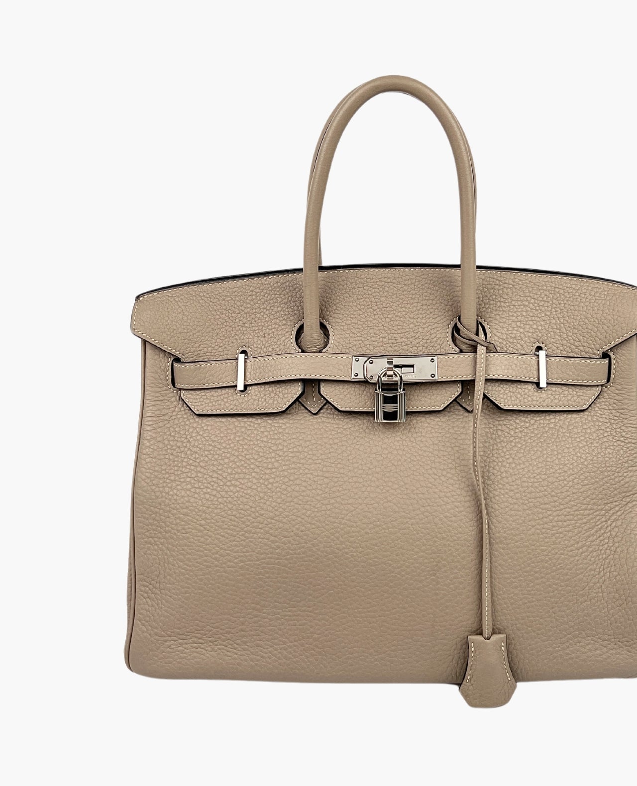Hermès Birkin bag featured in the very sought-after size 35. This stylish tote is beautifully crafted of textured Clemence leather in Dove Gray. The luxurious handbag features rolled leather top handles, a front flap, and strap closure with polished palladium plated hardware including a turn lock. The color is neutral and versatile, making this bag perfect for all occasions. Accentuated with golden hardware, this Birkin bag is one of a kind and you’ll get heads spinning everywhere you go.