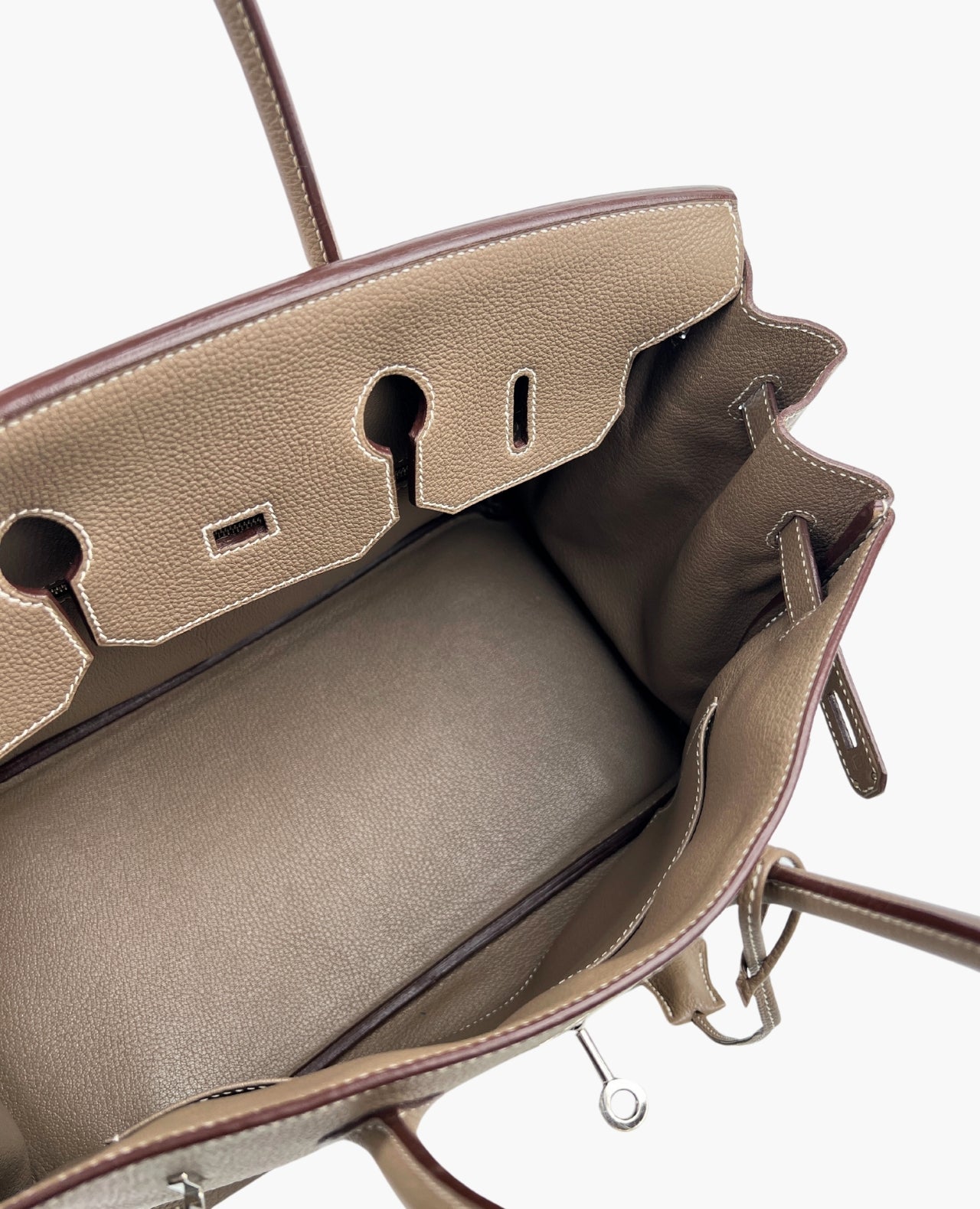 The Hermès Birkin 35 in Togo leather and Etoupe is a timeless icon of luxury and craftsmanship. The Birkin bag was originally created in 1984 for actress and singer Jane Birkin, this legendary handbag quickly became a symbol of status and impeccable taste. This particular model features elegant white stitching and is beautifully complemented by Palladium hardware (PHW), with the versatile and highly sought-after Etoupe color that effortlessly elevates any look.