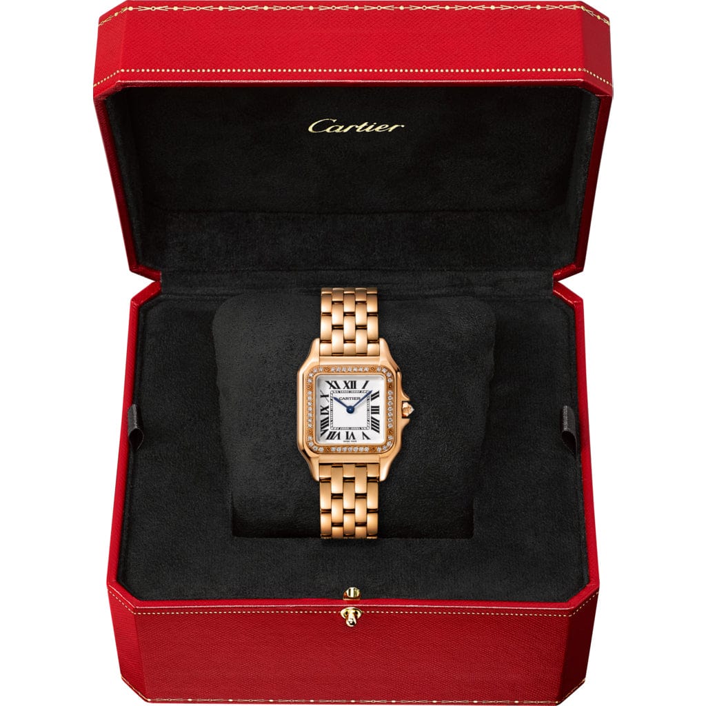 Panthère de Cartier watch, ref. WJPN0009 is a size medium 18kt pink gold model with brilliant-cut diamonds set in the bezel. The 18kt pink gold case measures 27 mm X 37 mm, with a thickness of 6.5 mm. This timepiece comes on matching 18kt pink gold bracelet, and is powered by a quartz movement. The crown is set with a synthetic blue spinel, silvered dial, blued-steel sword-shaped hands. Water-resistant to 3 bar (approx. 30 meters).
