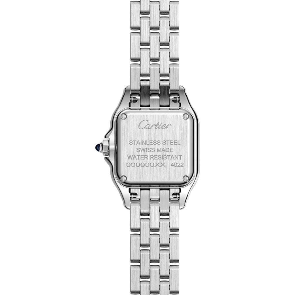 Panthère de Cartier watch, ref. WSPN0006 is a small steel model, measuring 22 mm X 30 mm, with a thickness of 6 mm. This timepiece is powered by a quartz movement. The crown is set with a synthetic blue spinel, silvered dial, blued-steel sword-shaped hands, steel bracelet. Water-resistant to 3 bar (approx. 30 meters).