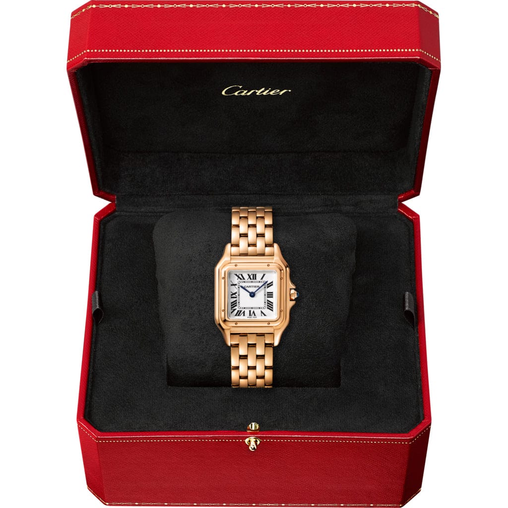 Panthère de Cartier watch, ref. WGPN0007 is a medium 18kt pink gold model, measuring 27 mm X 37 mm, with a thickness of 6.5 mm. This timepiece comes on matching 18kt pink gold bracelet, and is powered by a quartz movement. The crown is set with a synthetic blue spinel, silvered dial, blued-steel sword-shaped hands. Water-resistant to 3 bar (approx. 30 meters).