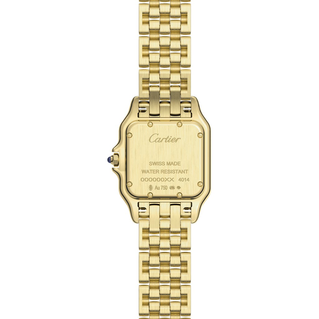 Panthère de Cartier watch, ref. WGPN0009 is a medium 18kt yellow gold model, measuring 27 mm X 37 mm, with a thickness of 6.5 mm. This timepiece comes on a bracelet, and is powered by a quartz movement. The crown is set with a synthetic blue spinel, silvered dial, blued-steel sword-shaped hands. Water-resistant to 3 bar (approx. 30 meters).