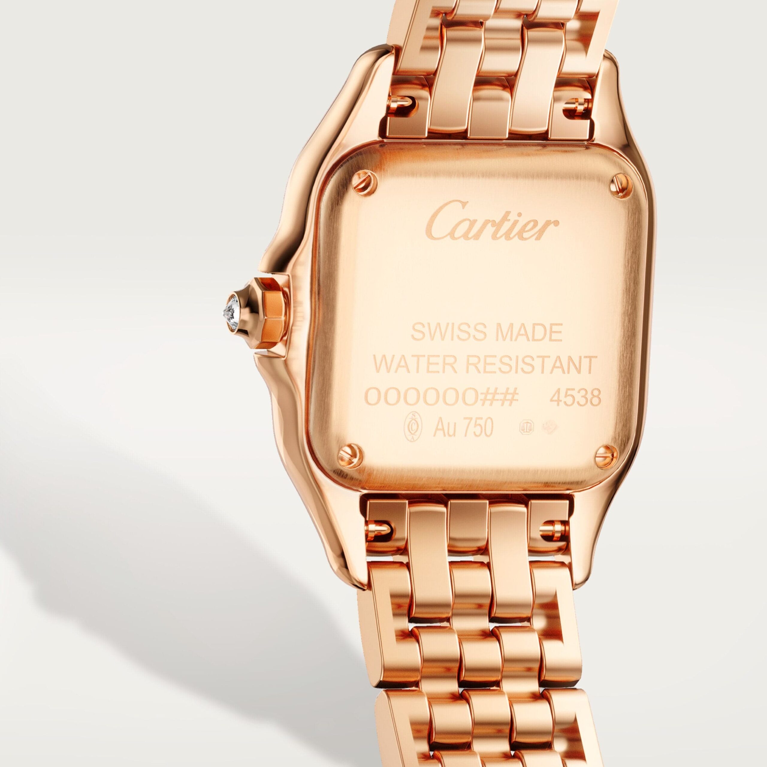 Panthère de Cartier watch, small model, quartz movement. 18K rose gold (750/1000) case set with 36 brilliant-cut diamonds totaling 0.23 carats. Dimensions: 30.3 mm x 22 mm, thickness: 6.3 mm. 18K rose gold (750/1000) octagonal crown set with a brilliant-cut diamond totaling 0.02 carats. Silvered sunray-brushed dial set with 60 brilliant-cut diamonds totaling 0.12 carats, rose gold-finish sword-shaped hands. 18K rose gold (750/1000) bracelet. Water-resistant up to 3 bar (approx. 30 meters/100 feet).