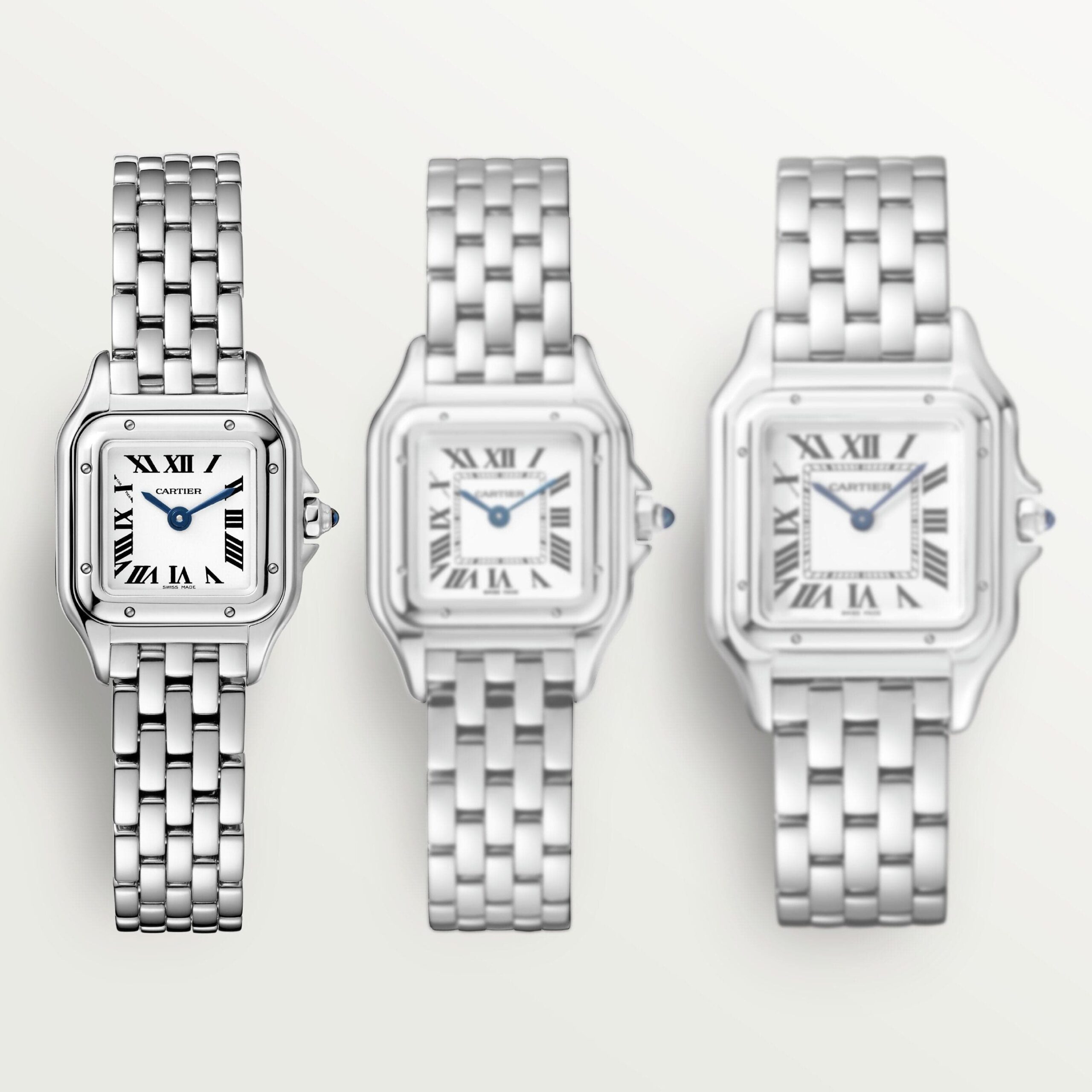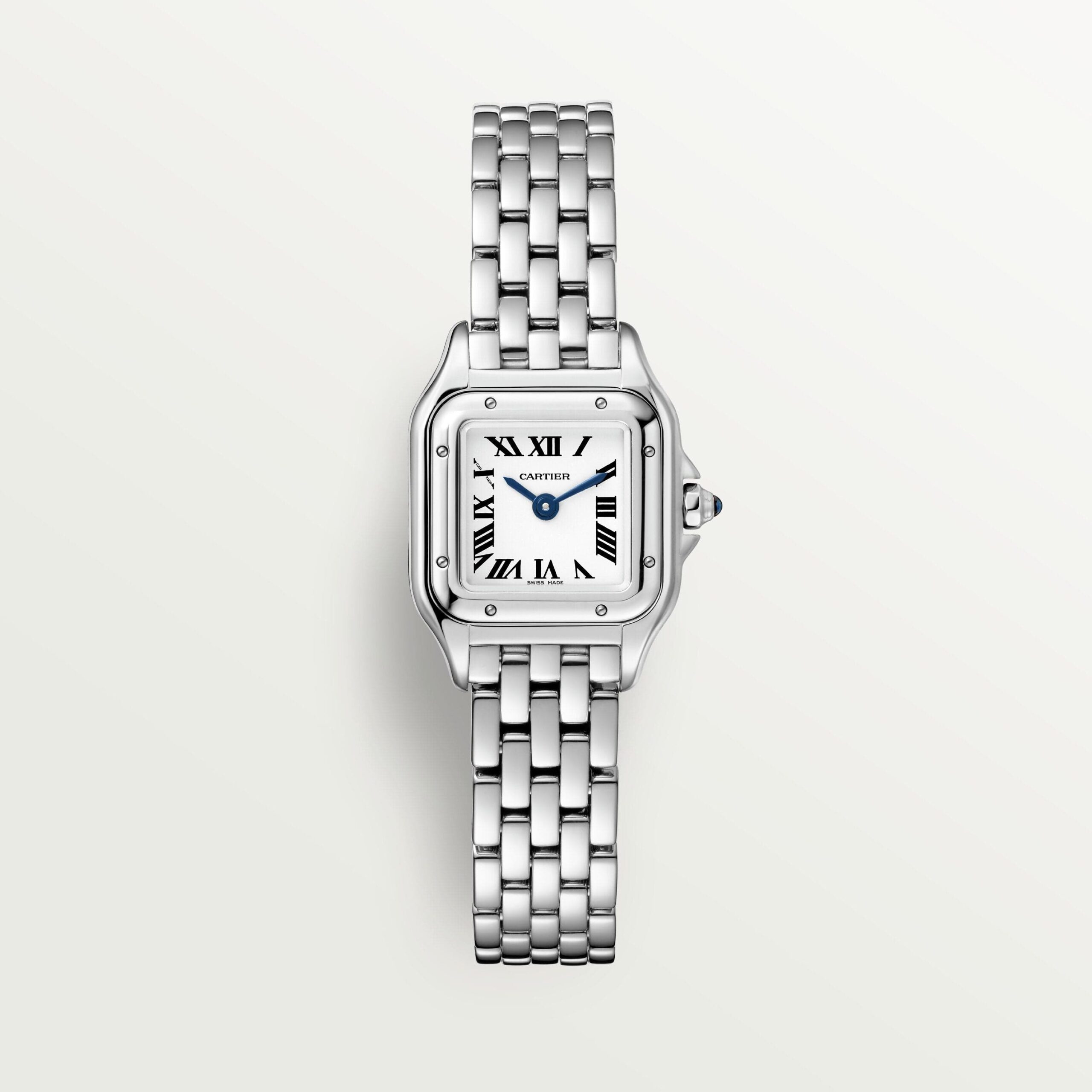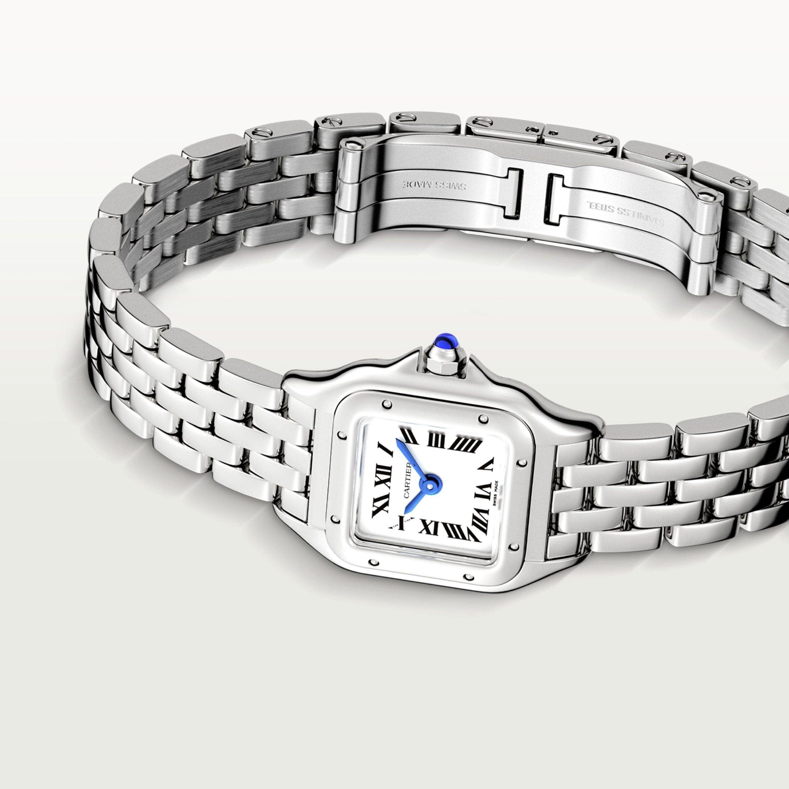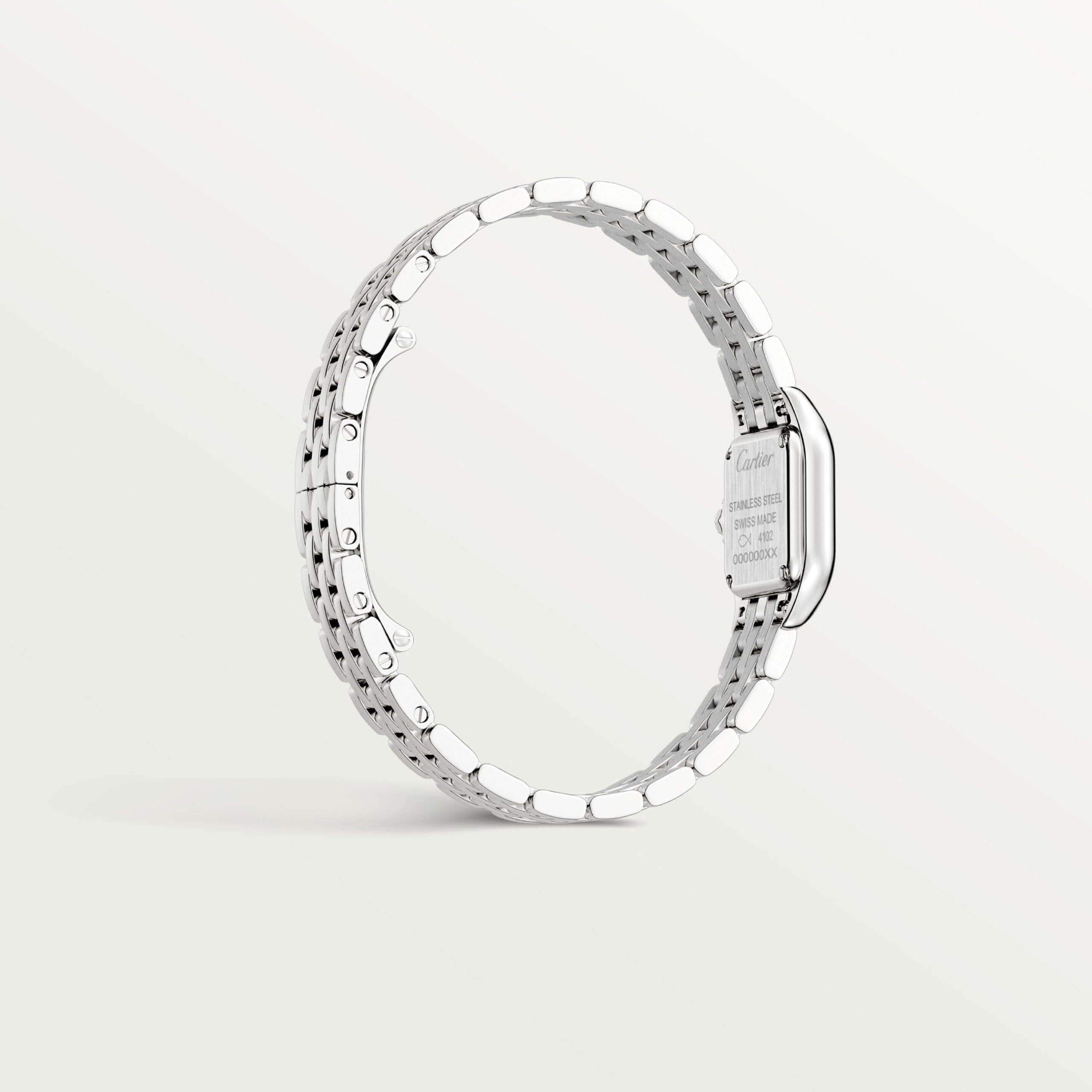 Panthère de Cartier watch, mini model, quartz movement. Steel case and bracelet. Octagonal crown set with a blue synthetic spinel. Silver dial, blued-steel sword-shaped hands, sapphire crystal. Case dimensions: 25 mm x 19 mm, thickness: 6 mm. Water-resistant up to 3 bar (approx. 30 meters/100 feet).