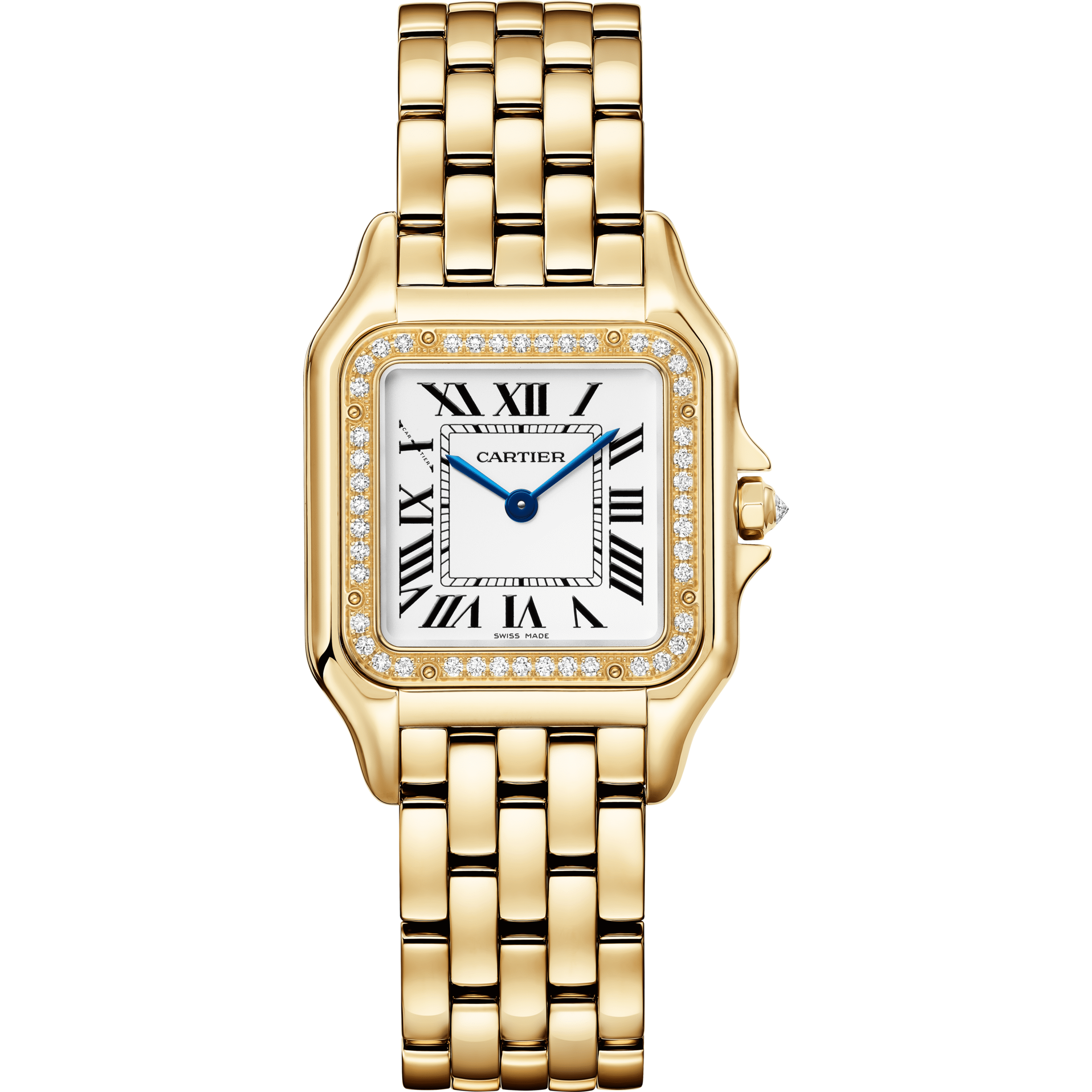 Panthère de Cartier watch, medium model, quartz movement. Case in yellow gold 750/1000 set with brilliant-cut diamonds, dimensions: 27 mm x 36 mm, thickness: 6 mm, crown set with a diamond, silvered dial, blued-steel sword-shaped hands, yellow gold 750/1000 bracelet, water-resistant to 3 bar (approx. 30 meters).