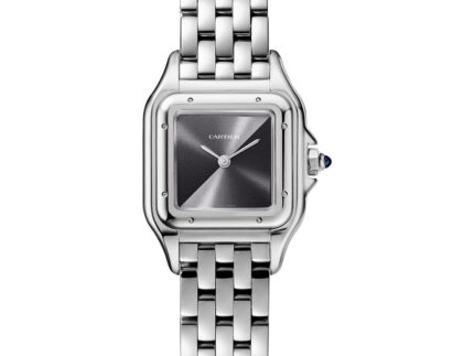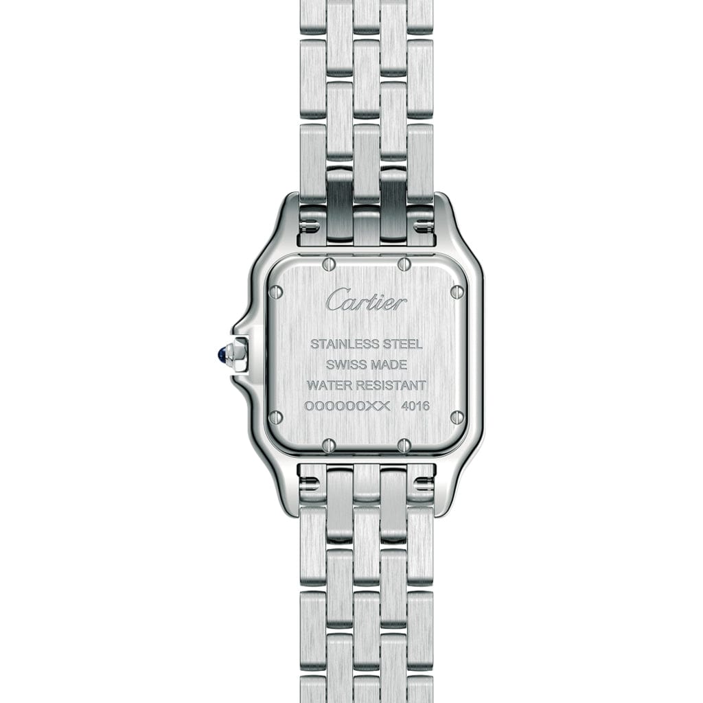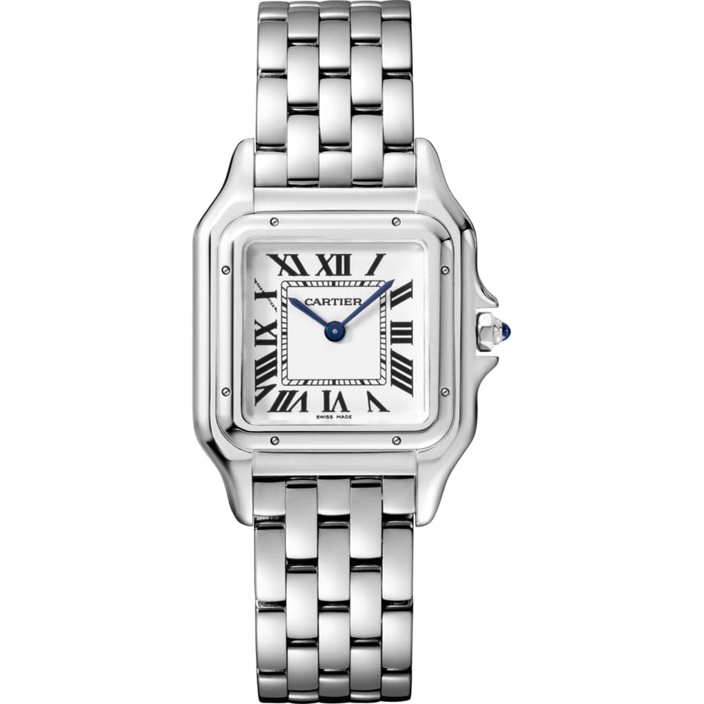 Panthère de Cartier watch, ref. WSPN0007 is a medium steel model, measuring 27 mm X 37 mm, with a thickness of 6.5 mm. This timepiece is powered by a quartz movement. The crown is set with a synthetic blue spinel, silvered dial, blued-steel sword-shaped hands, steel bracelet. Water-resistant to 3 bar (approx. 30 meters).