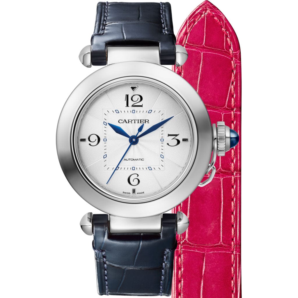 Pasha de Cartier watch, 35 mm, mechanical movement with automatic winding, caliber 1847 MC. Steel case, fluted crown cap and crown set with synthetic spinels, silver flinqué dial, blued-steel diamond-shaped hands, 2 navy and fuchsia alligator-skin straps with “”QuickSwitch”” interchangeability system, interchangeable steel deployant buckle.  Case diameter: 35 mm, thickness: 9.37 mm. Water-resistant to 10 bar (approx. 100 meters/100 feet).