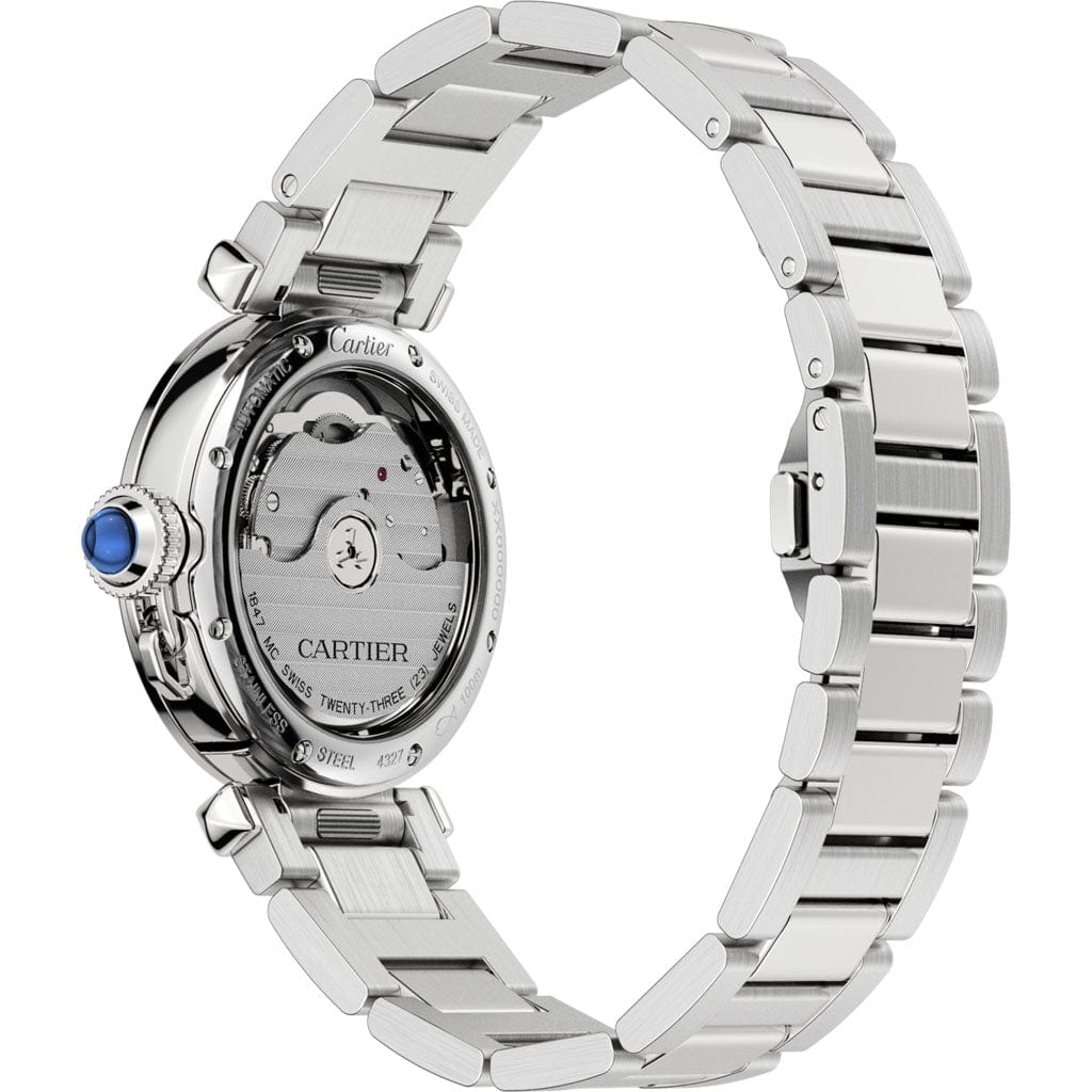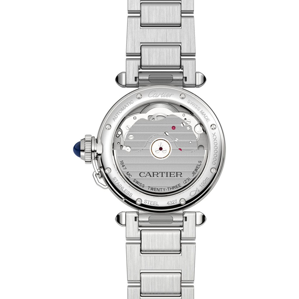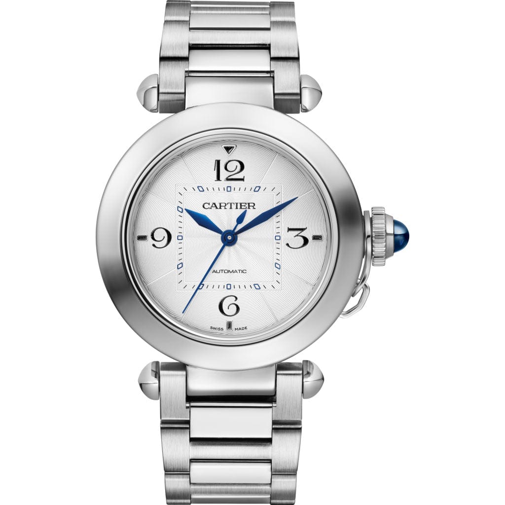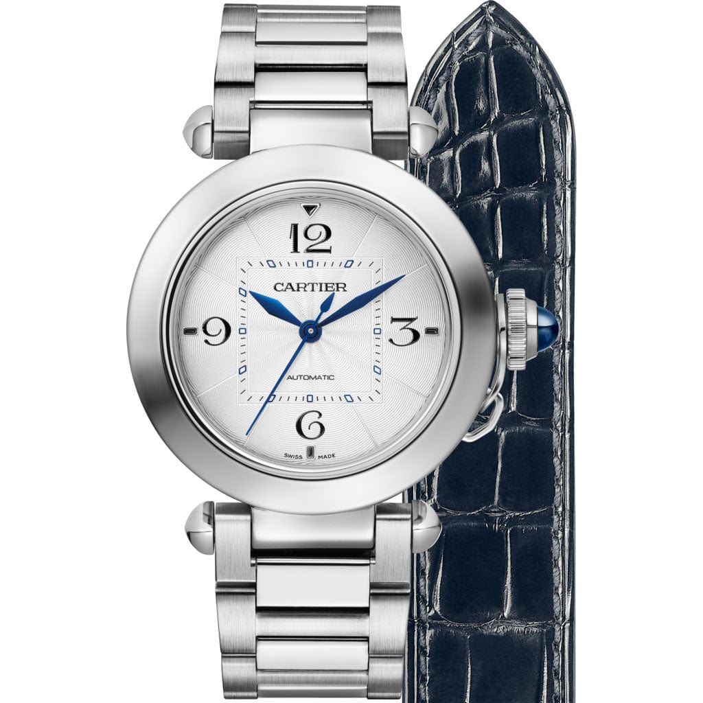 Pasha de Cartier watch, 35 mm, mechanical movement with automatic winding, caliber 1847 MC. Steel case, fluted crown cap and crown set with synthetic spinels, silver flinqué dial, blued-steel diamond-shaped hands, steel bracelet with “”SmartLink”” adjustment system, second navy alligator-skin strap, interchangeable steel deployant buckle. Both bracelets are fitted with the “”QuickSwitch”” interchangeability system. Case diameter: 35 mm, thickness: 9.37 mm. Water-resistant to 10 bar (approx. 100 meters/100 feet).