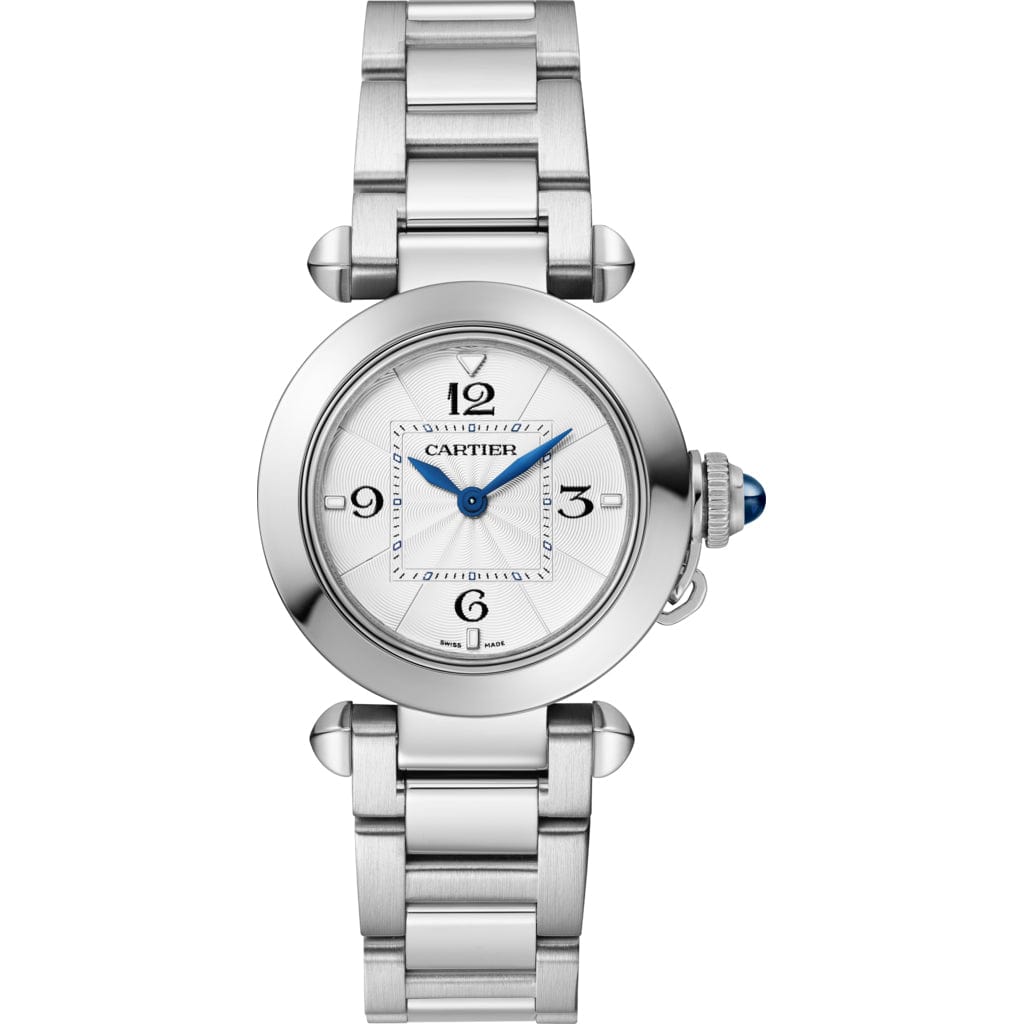 Pasha de Cartier watch, 30 mm, high autonomy quartz movement. Steel case, fluted crown cap and crown set with synthetic spinels, opaline flinqué dial, blued steel diamond-shaped hands, steel bracelet, second strap in fuchsia leather, interchangeable steel deployant buckle. Both bracelets are fitted with the “QuickSwitch” interchangeability system. Case diameter: 30 mm, thickness: 8.22 mm. Water-resistant up to 3 bar (approx. 30 meters/100 feet).