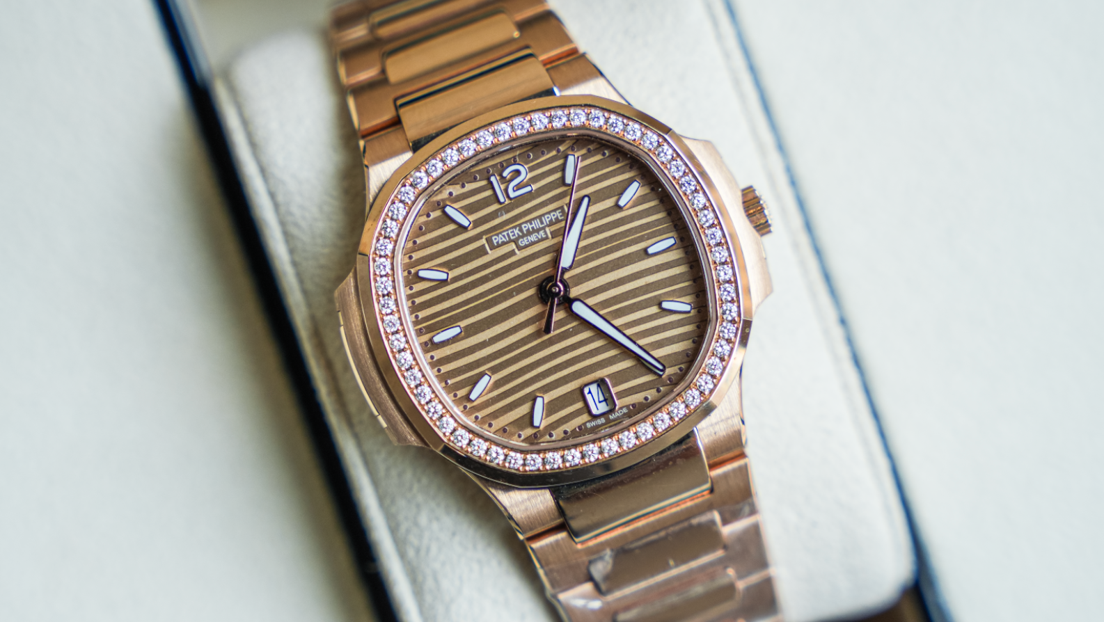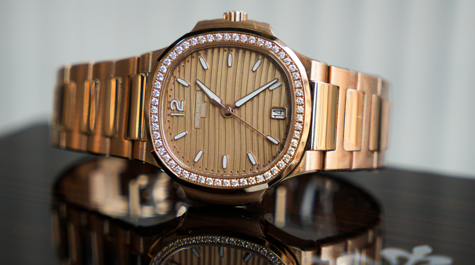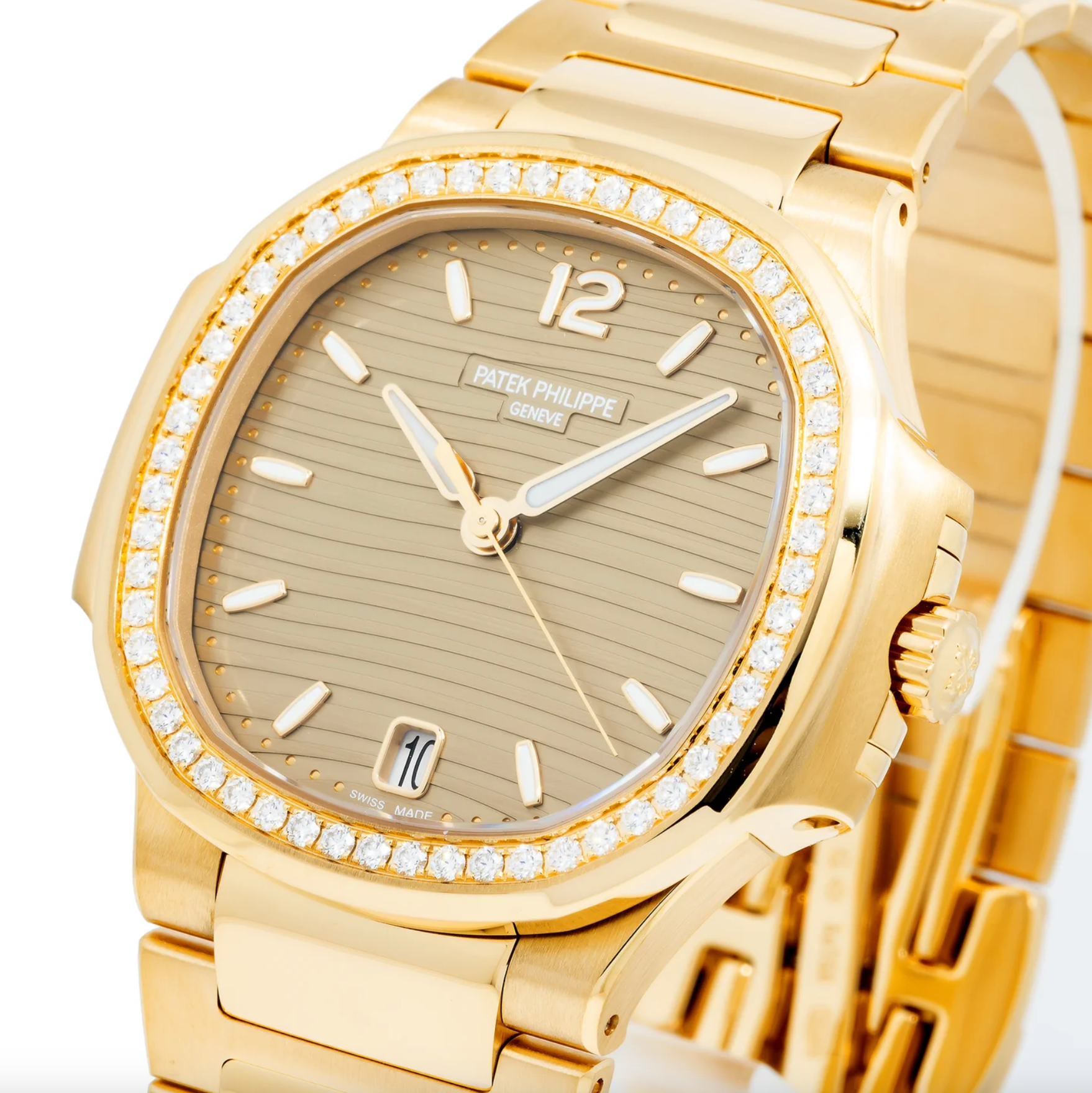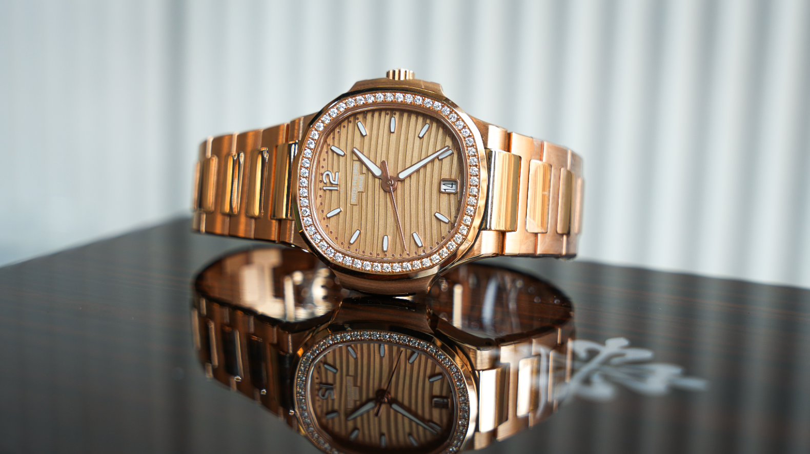 The dial — a rich golden opaline — is adorned with horizontal embossed waves, a signature Nautilus motif. It features applied rose gold hour markers with luminous coating and elegant alpha-style hands, ensuring legibility while preserving the refined aesthetic. A discreet date aperture at 6 o’clock adds everyday functionality to this striking timepiece.