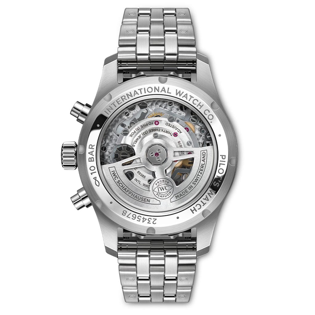 FEATURES: Chronograph function with hours, minutes and seconds, Day and date display, Glass secured against displacement by drop in air pressure, Sapphire glass, convex, antireflective coating on both sides, IWC bracelet quick-change system, Small hacking seconds