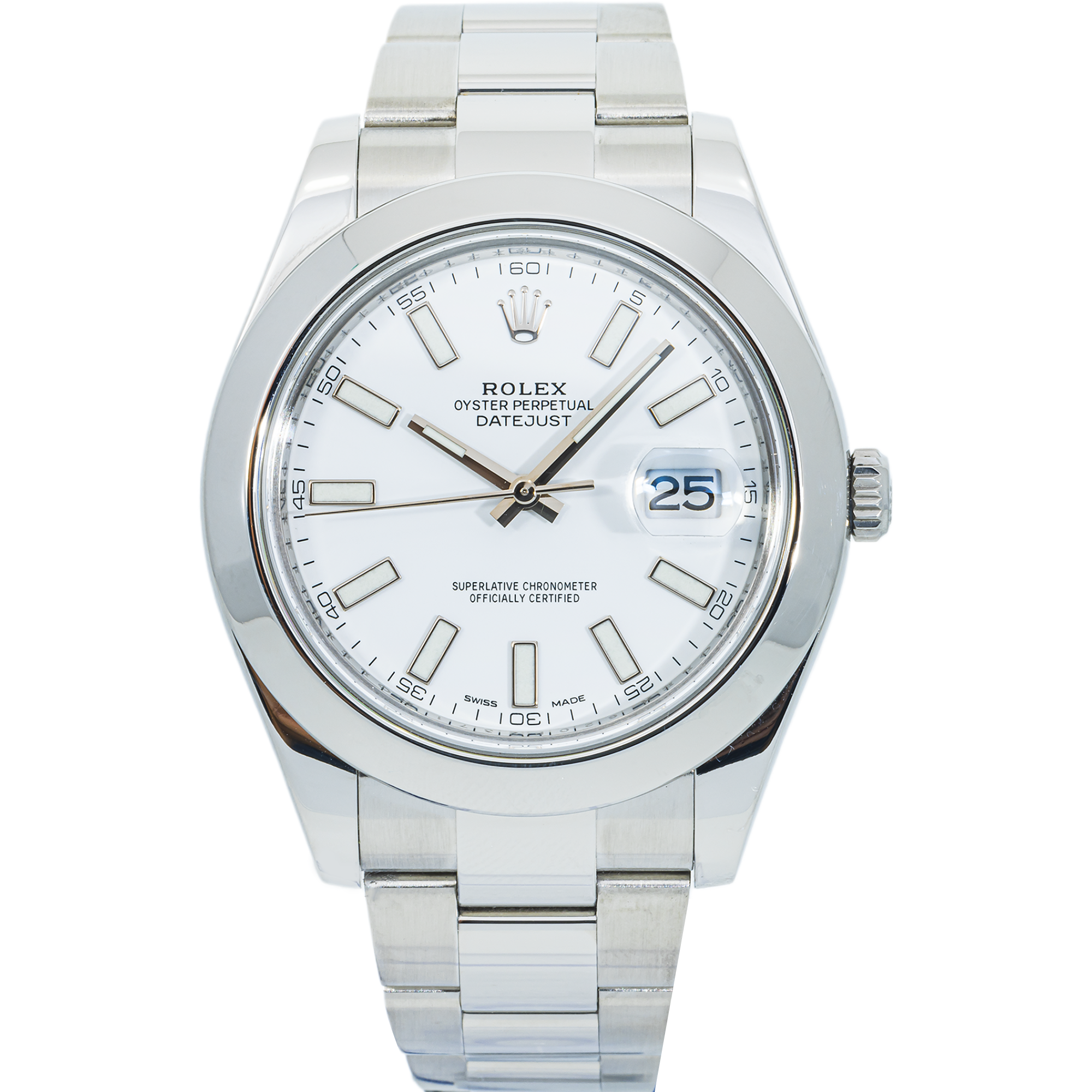 Discover the Rolex Datejust II 116300 with a bold 41mm stainless steel case, smooth bezel, and crisp white dial—where timeless elegance meets modern style.