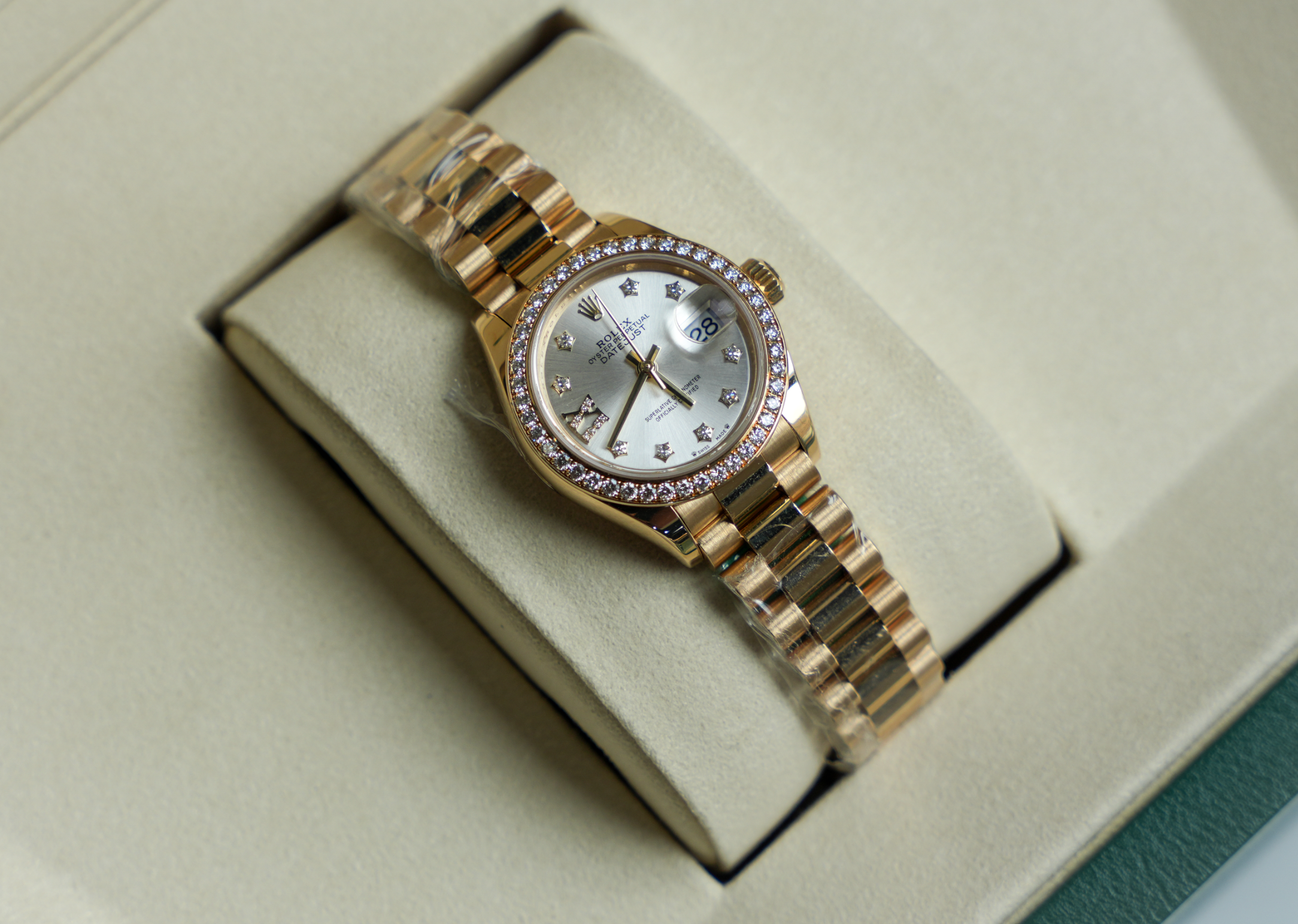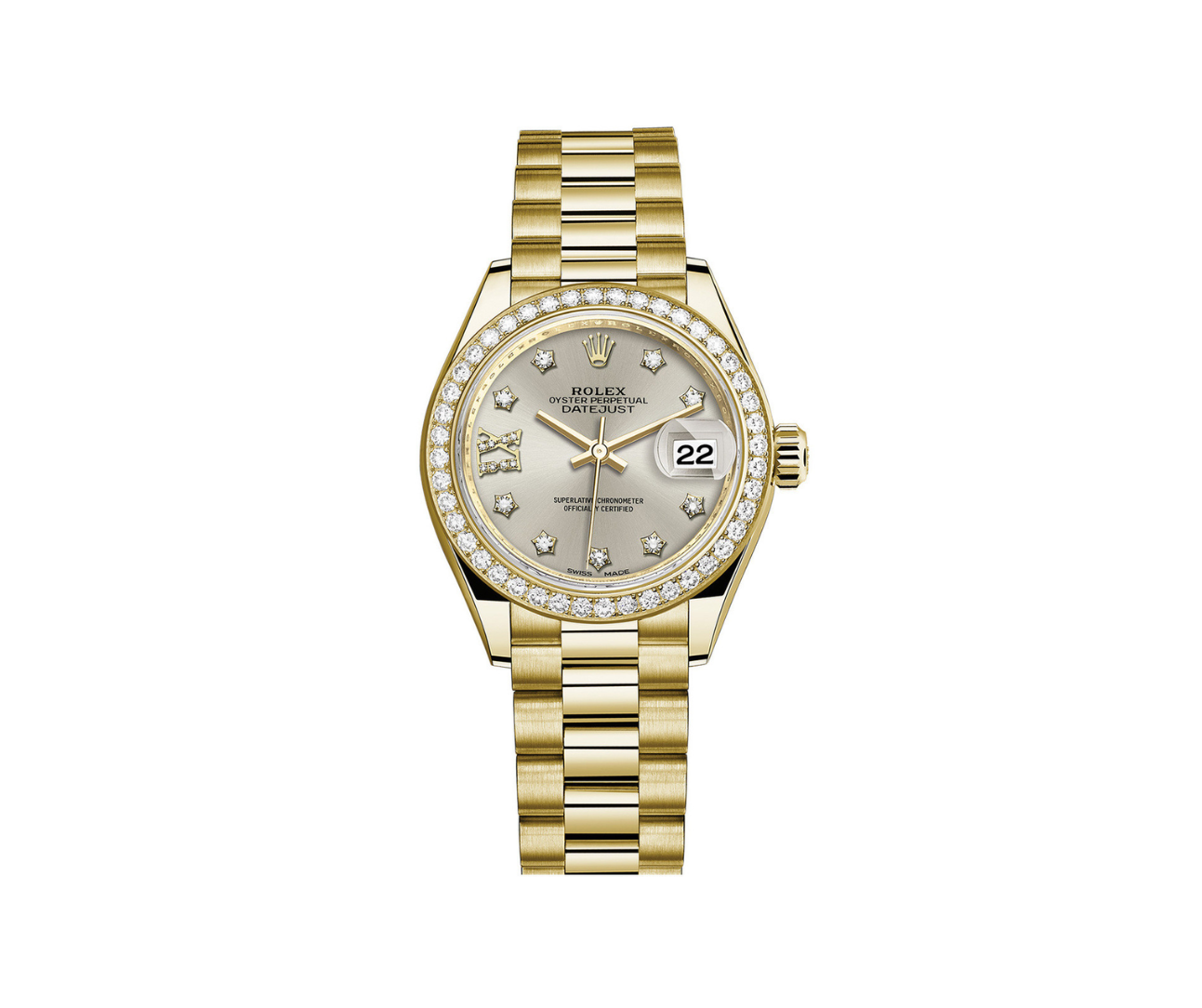 The Rolex Lady-Datejust 28 Ref. 279138RBR in 18 k yellow gold with a diamond bezel and silver dial blends refined luxury with Rolex’s legendary craftsmanship.