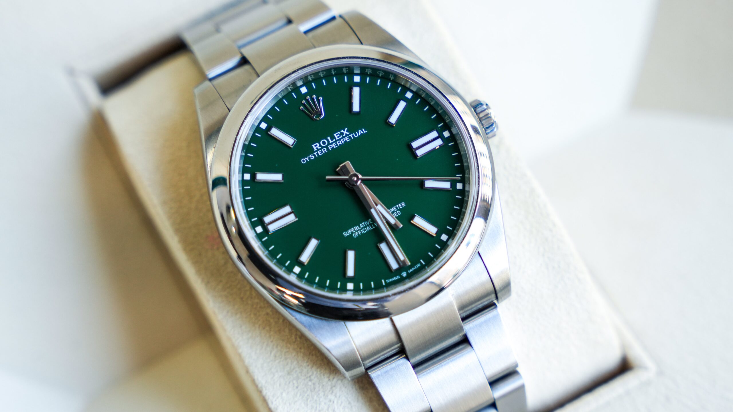 Striking, contemporary, and unmistakably Rolex, the Oyster Perpetual 124300-0005 features a vivid green dial that adds a bold pop of color to the brand’s clean and timeless design language. With a 41mm Oyster steel case and a smooth polished bezel, this reference embodies Rolex’s legacy of durability and style in a modern, eye-catching package.