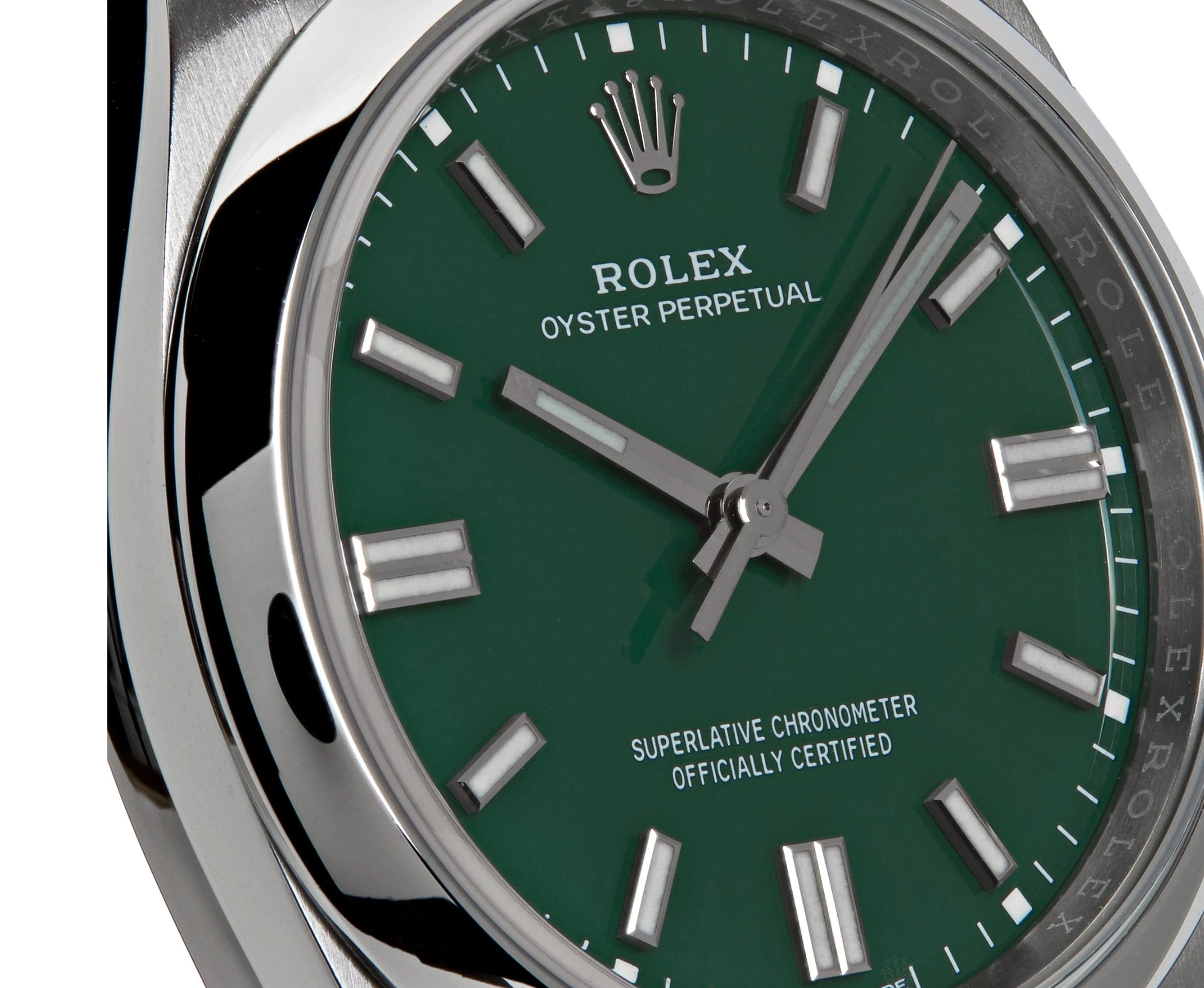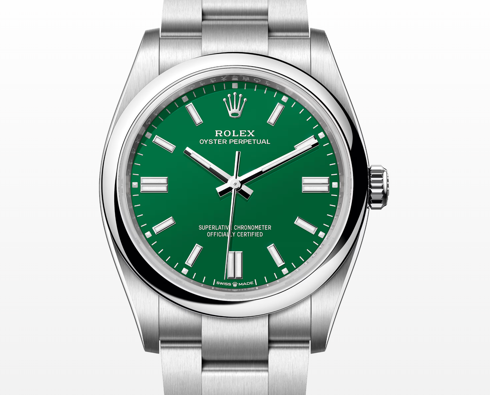 The Rolex Oyster Perpetual 36 Ref. 126000 in stainless steel with a vibrant green dial is a modern classic, combining everyday versatility with collector appeal.