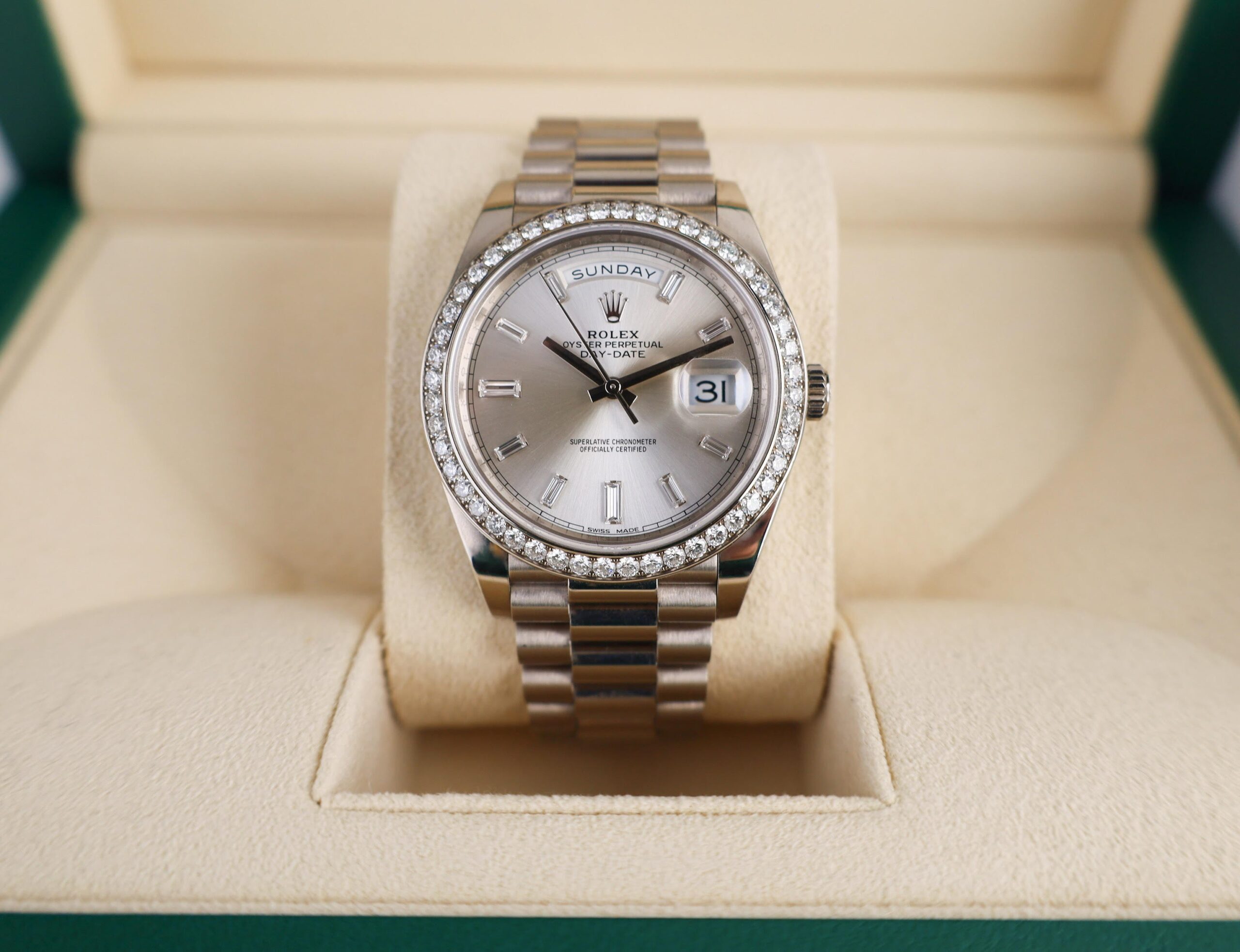 Rolex White Gold Day-Date 40 Watch – White Gold Bezel – Silver Baguette Diamond Dial – President Bracelet – 228349RBR sbdp