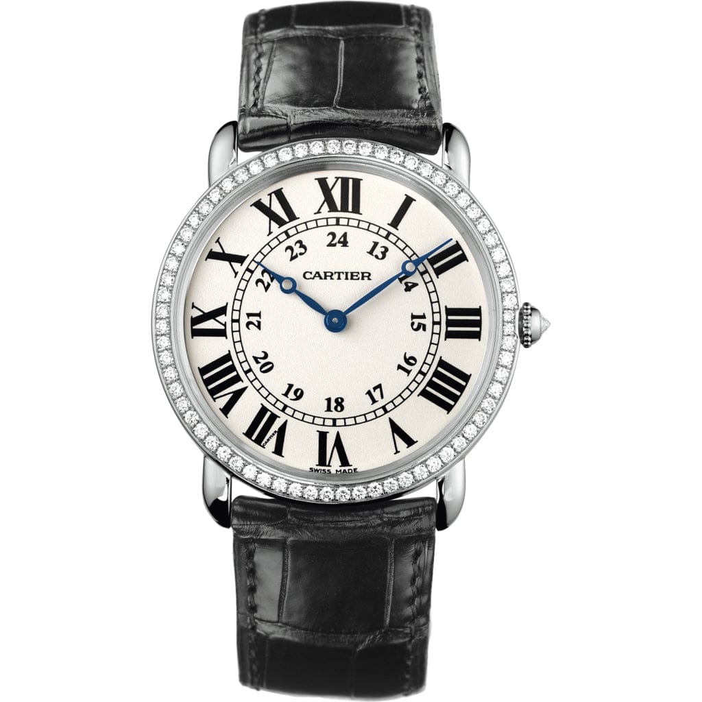 Incorporating Roman numerals, blue sword-shaped hands, a winding mechanism crowned with a sapphire and a rail-track minute circle: the Ronde Louis Cartier watch is a classic timepiece by Cartier. The alligator-skin strap may be paired with a choice of rose gold or white gold or with diamonds.