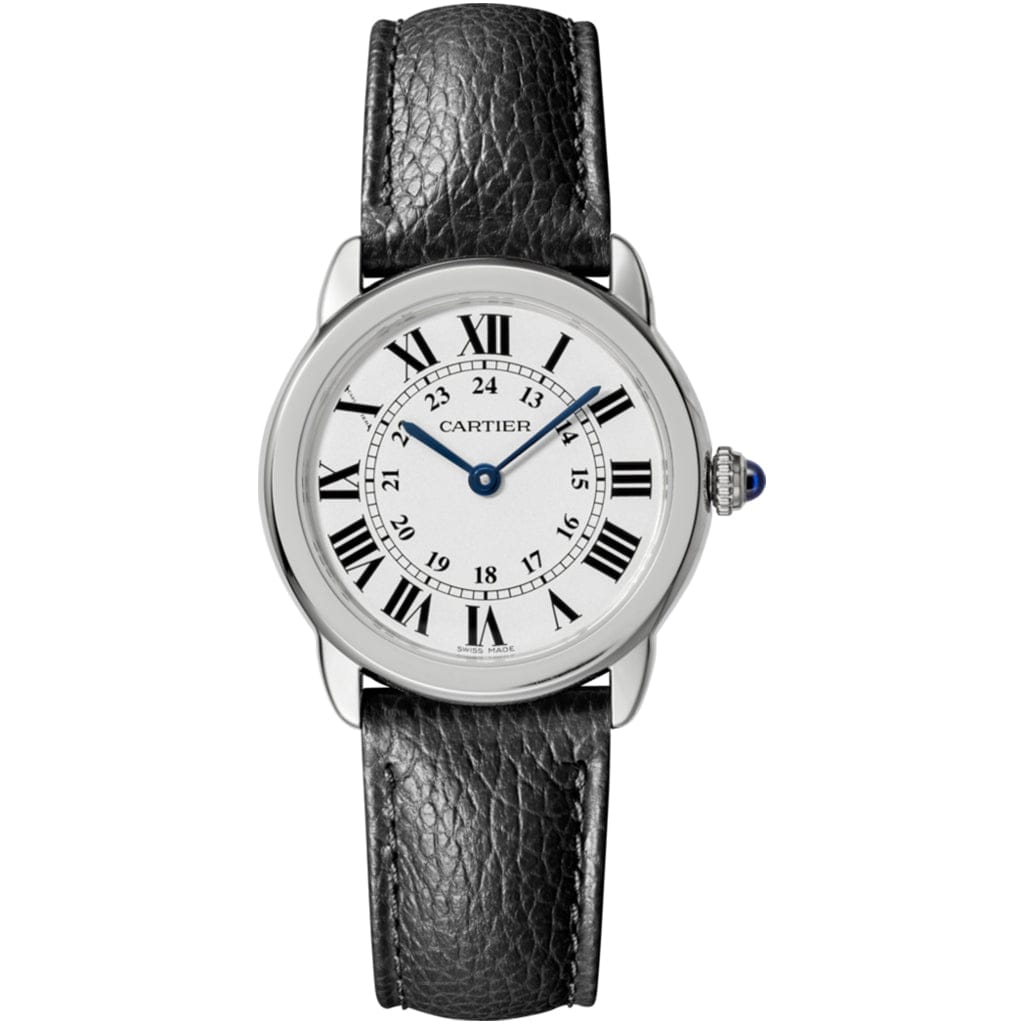 Ronde Solo de Cartier watch, 29 mm, quartz movement. Steel case, beaded crown set with a synthetic cabochon-shaped spinel, silvered light opaline dial, blued-steel sword-shaped hands, sapphire crystal, black grained calfskin interchangeable strap, steel double adjustable folding buckle. Case thickness: 6.35 mm. Water-resistant to 3 bar (approx. 30 meters/100 feet).