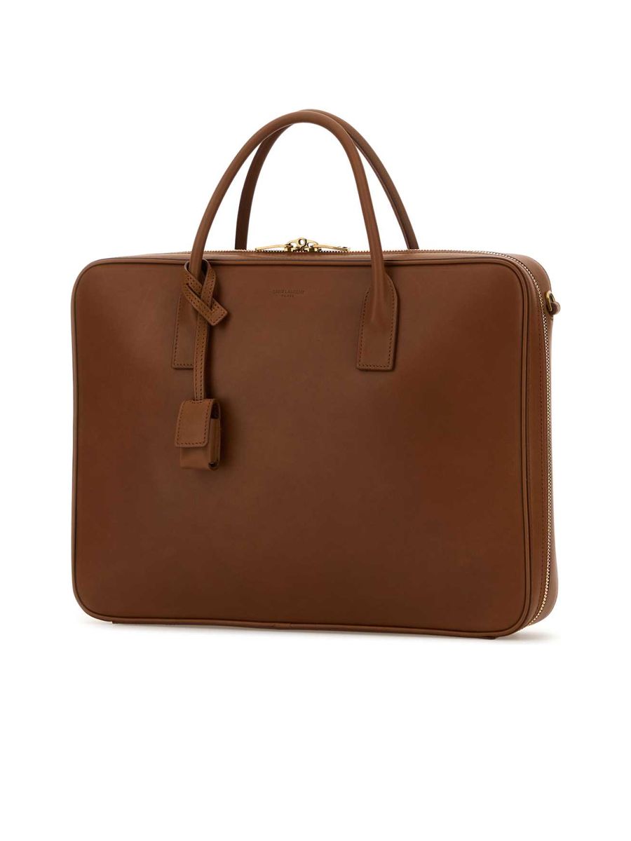 Embrace the sophistication of Saint Laurent with this structured briefcase, perfect for carrying your daily essentials and documents in style. The sleek design is complemented by antiqued golden metal finishing, offering a touch of timeless luxury for the discerning gentleman.
