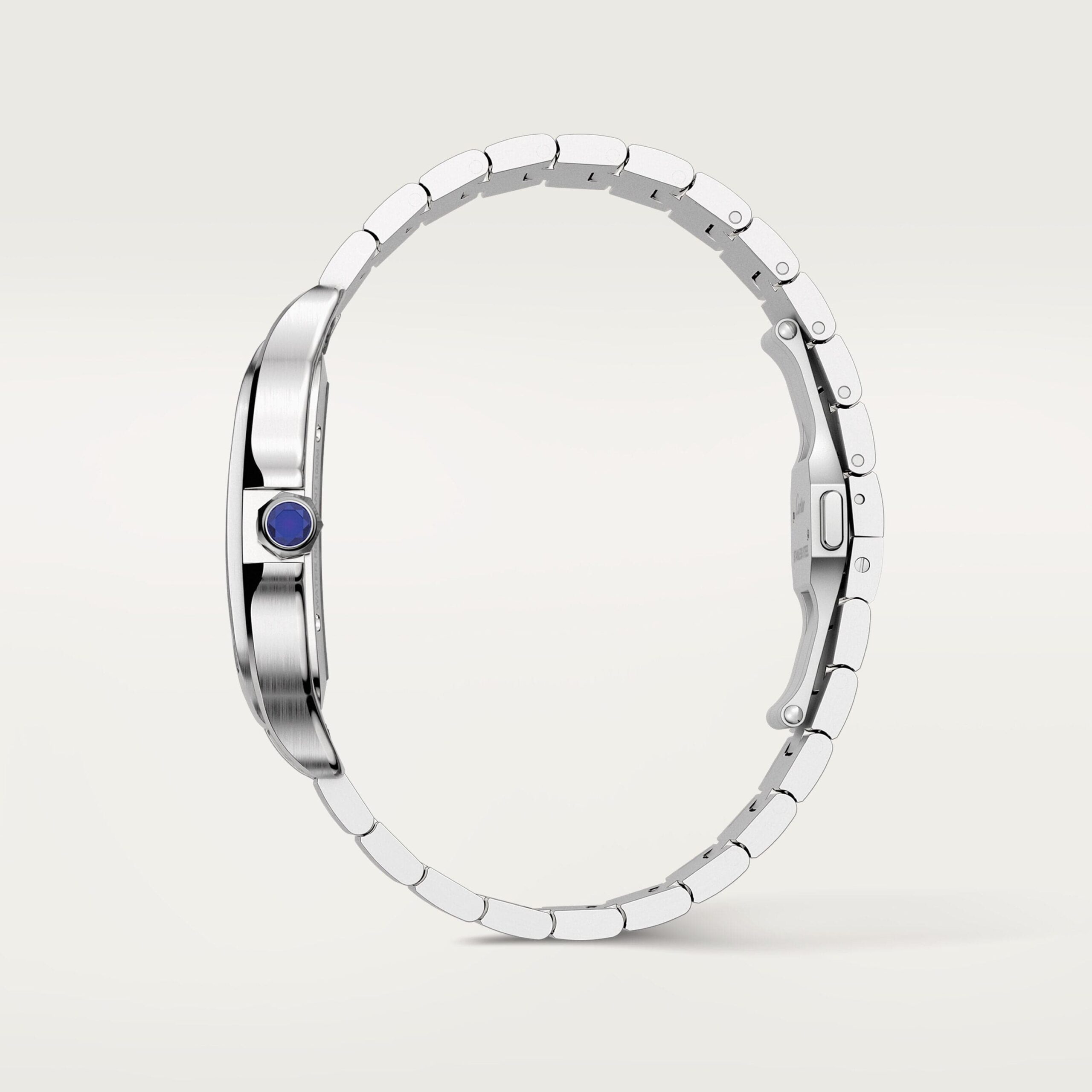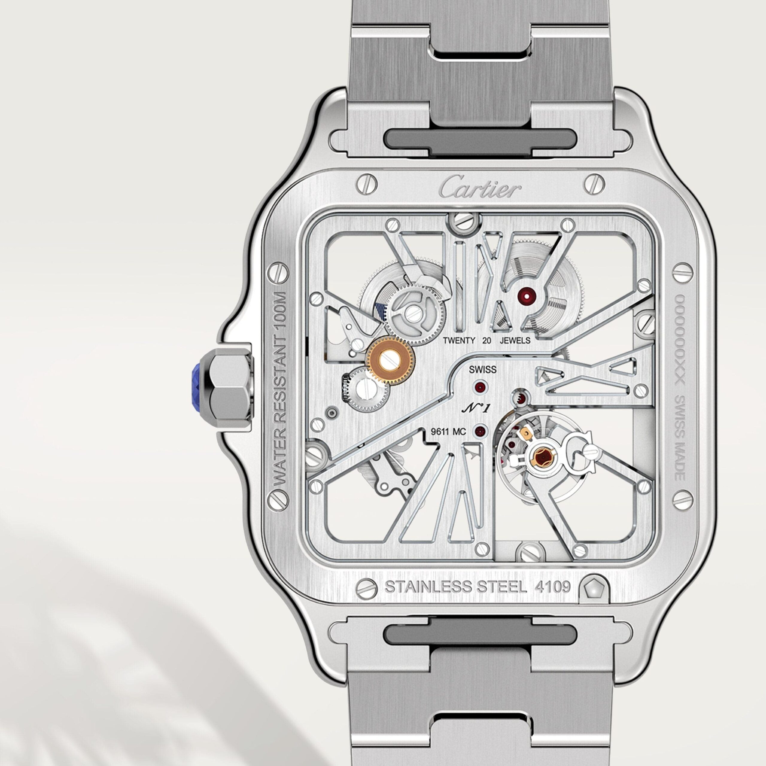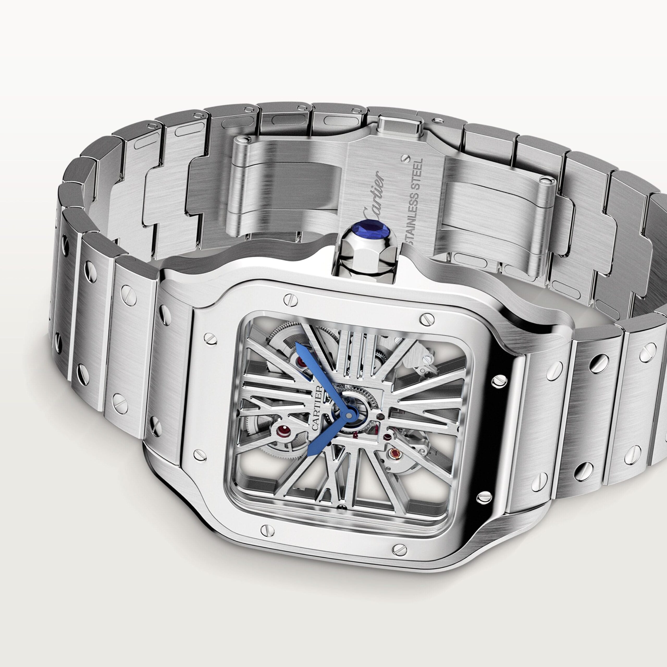 Santos Skeleton watch, large model, Manufacture mechanical movement with manual winding, caliber 9611 MC. Steel case, heptagonal crown set with a faceted sapphire, blued-steel sword-shaped hands, sapphire crystal and case back. Steel bracelet with “SmartLink” adjustment system. Second bracelet in leather, with steel interchangeable deployant buckle. Both bracelets are equipped with the “QuickSwitch” interchangeability system. Hours and minutes with skeletonized bridges forming Roman numerals. Individually numbered movement consisting of 138 parts including 20 rubies. Movement dimensions: 28 mm x 28 mm, movement thickness: 3.97 mm, balance: 28,800 vibrations/hour, power reserve approx. 72 hours. Case width: 39.8 mm, thickness: 9.08 mm. Water-resistant up to 10 bar (approx. 100 meters/330 feet).