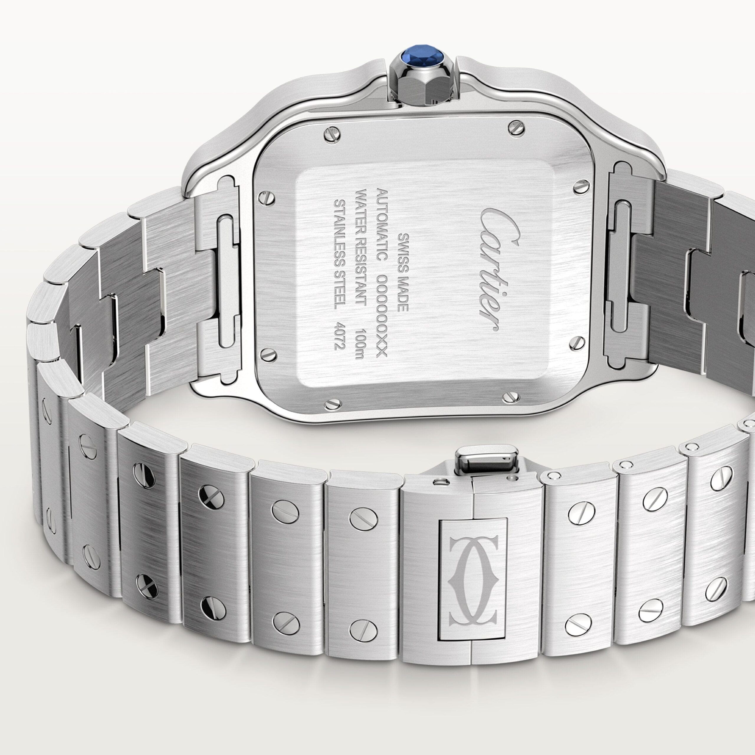 Santos de Cartier watch, large model, mechanical movement with automatic winding 1847 MC. Steel case, 7-sided crown set with a faceted synthetic blue spinel, satin-finish gradated brown sunray-brushed dial, rhodium-finish polished steel sword-shaped hands with luminescent material, sapphire crystal. Steel bracelet with SmartLink adjustment system. Second strap in brown leather, with interchangeable folding steel buckle. Both are fitted with the QuickSwitch interchangeable system. Case width: 39.8 mm, thickness: 9.38 mm. Water-resistant to 10 bar (approx. 100 meters).