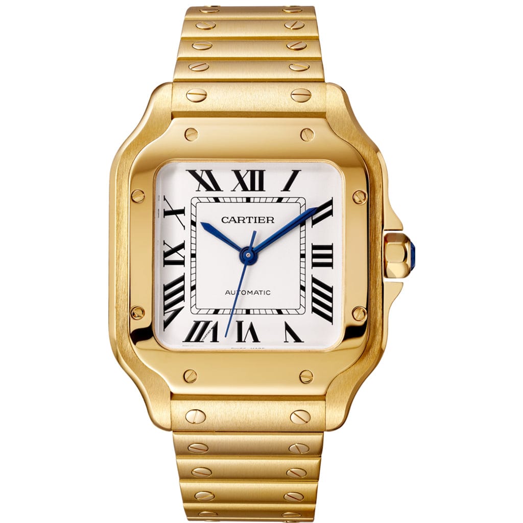 Santos watch, medium model, mechanical movement with automatic winding, 1847 MC. Case in 18K yellow gold, seven-sided crown in 18K yellow gold set with a faceted sapphire, silvered opaline dial, blued-steel sword-shaped hands, sapphire crystal. 18K yellow gold bracelet with “SmartLink” resizing system. Second bracelet in alligator skin, with double adjustable folding buckle in 18K yellow gold. The two bracelets are equipped with the “QuickSwitch” interchangeability system. Case width: 35.1 mm, thickness: 8.83 mm. Water-resistant to 10 bar (approx. 100 metres).
