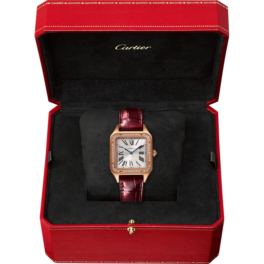 Santos-Dumont watch, small model, high autonomy quartz movement (~ 6 years). Rose gold 750/1000 case, bezel set with 44 brilliant-cut diamonds and beaded crown set with one brilliant-cut diamond, totaling 0.53 carat, silver satin-brushed dial with sunray-effect, Roman numerals, blued-steel sword-shaped hands, sapphire crystal. Burgundy shiny alligator leather strap, rose gold 750/1000 ardillon buckle. Case dimensions: 38 mm x 27.5 mm, thickness: 7.3 mm. Water-resistant up to 3 bar (approx. 30 meters/100 feet).