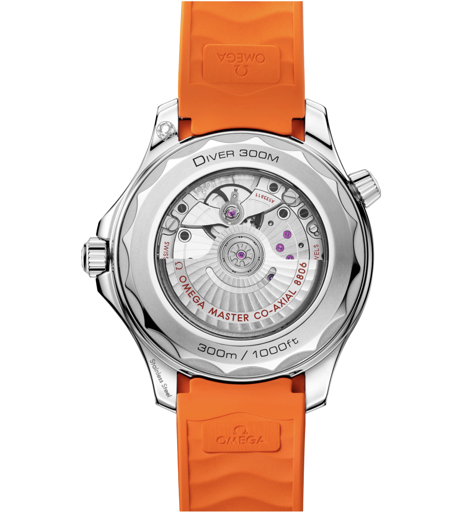 The watch is presented on an integrated orange rubber strap with foldover clasp, and is driven by the OMEGA Co-Axial Master Chronometer Calibre 8806, which can be seen through the sapphire crystal caseback.