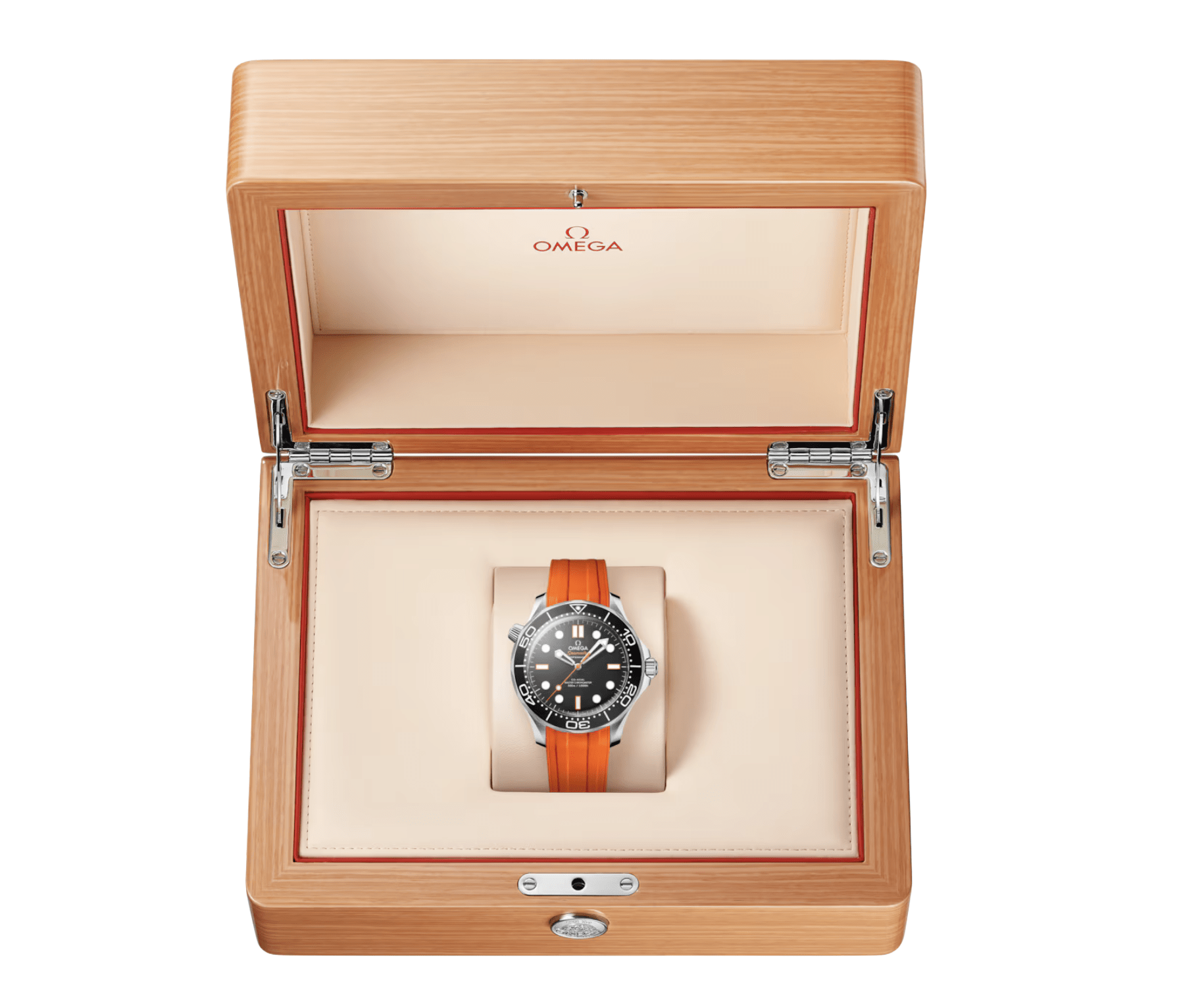 This 42 mm model is crafted in stainless steel and includes a black oxalic anodized aluminium bezel ring with a diving scale in white Super-LumiNova.Black aluminium is also used to create the dial, which features rhodium plated skeletonized hands and indexes that are filled with white Super-LumiNova. The colour orange is used for the central seconds hand, the four quarter indexes, and Seamaster name, while the OMEGA logo is transferred in white.