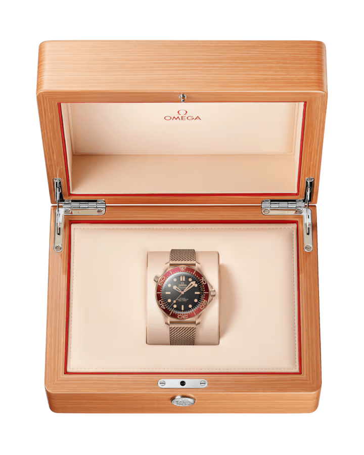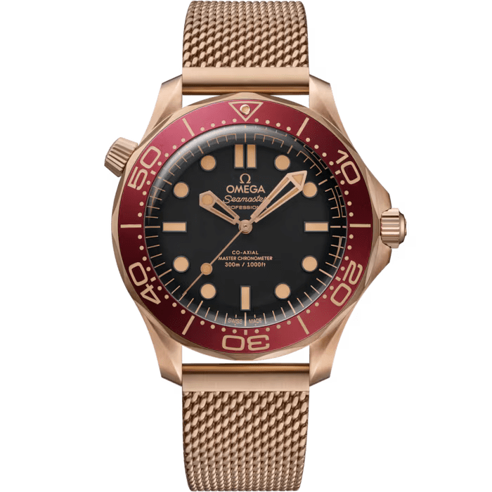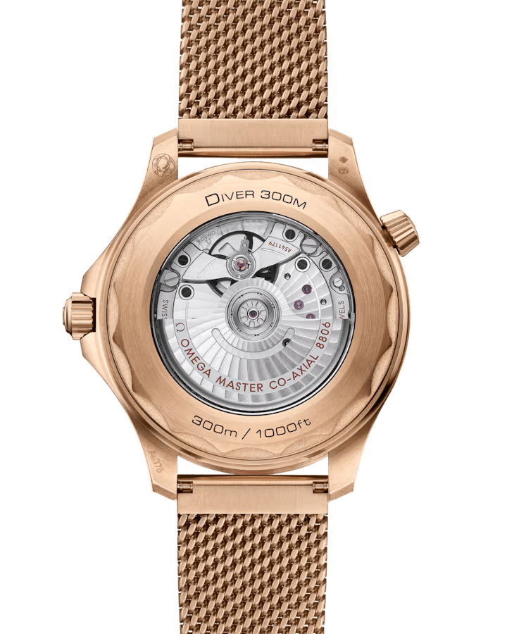 The OMEGA Seamaster Diver 300M is a 42 mm, Bronze Gold timepiece powered by the OMEGA Co-Axial Master Chronometer Calibre 8806, which is visible through the sapphire-crystal caseback. This Certified Master Chronometer features water resistance up to 300 meters, a burgundy oxalic anodized aluminium bezel ring, a sandblasted black aluminium dial with PVD 18K Bronze Gold hands and blackened indexes, a brushed mesh bracelet, and a power reserve of 55 hours