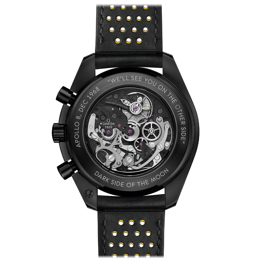 • Manual-winding chronograph movement. A Moon-relief textured and blackened version of the 1861 calibre which equipped the famous and contemporary Speedmaster Moonwatch.