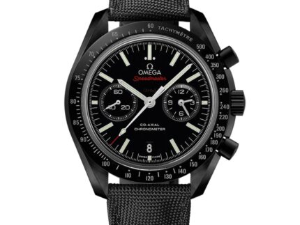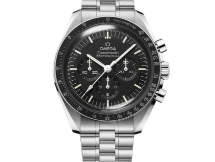 Self-winding chronograph with column wheel and Co-Axial escapement. Certified Master Chronometer, approved by METAS, resistant to magnetic fields reaching15,000 gauss. Silicon balance-spring, 2 barrels mounted in series. Central hour, minute and chronograph seconds hands, small seconds hand, date indication by hand, 12-hour and 60-minute recorders and moon phase indication. Rhodium plated finish with Geneva waves in arabesque.