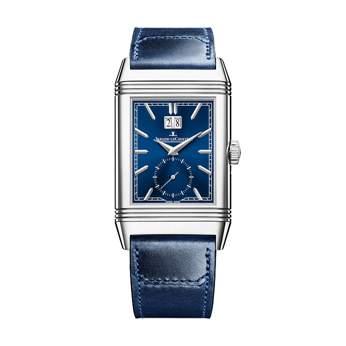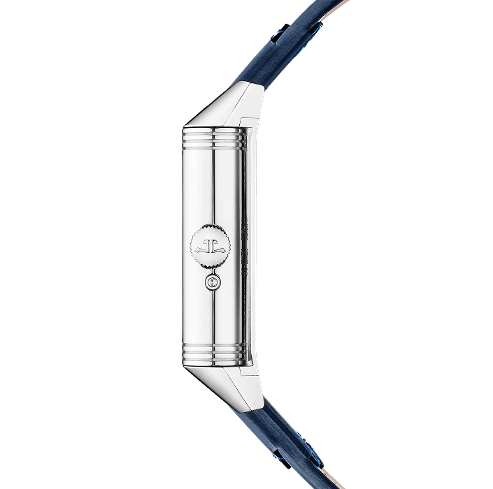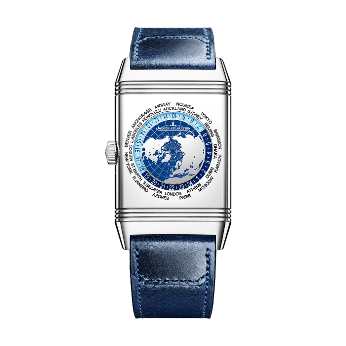 Inspired by the first models from 1931, the Reverso Tribute Geographic is the epitome of the watchmaking expertise of the Grande Maison. On the front, the Art Deco-style lacquered blue dial features a patented Grande Date offering excellent legibility. On the reverse, the display of the world time complication is as original as it is instinctive. The 24h world time disc rotates while the names of the cities are engraved directly on the steel case. In the centre, polished silver continents stand out against a hand-lacquered blue oceans. It is set by means of a sliding pusher that allows corrections to be made one hour at a time. The watch comes with two bracelets designed by Casa Fagliano: the first in blue leather, the second in the same colour, leather and canvas.